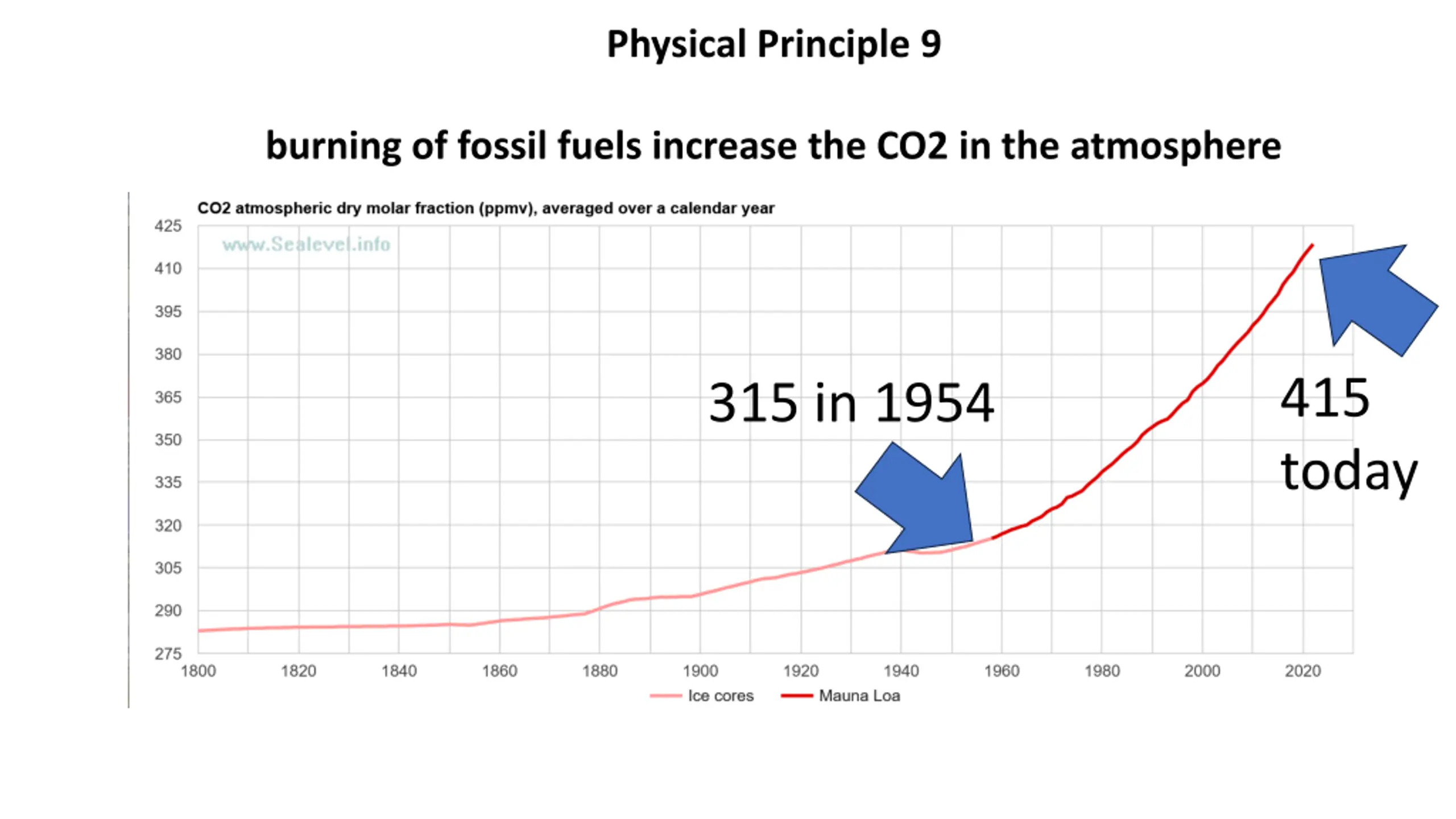 Physical Principle 9 burning of fossil fuels increase the CO2 in the atmosphere 415 today 315 in 1954