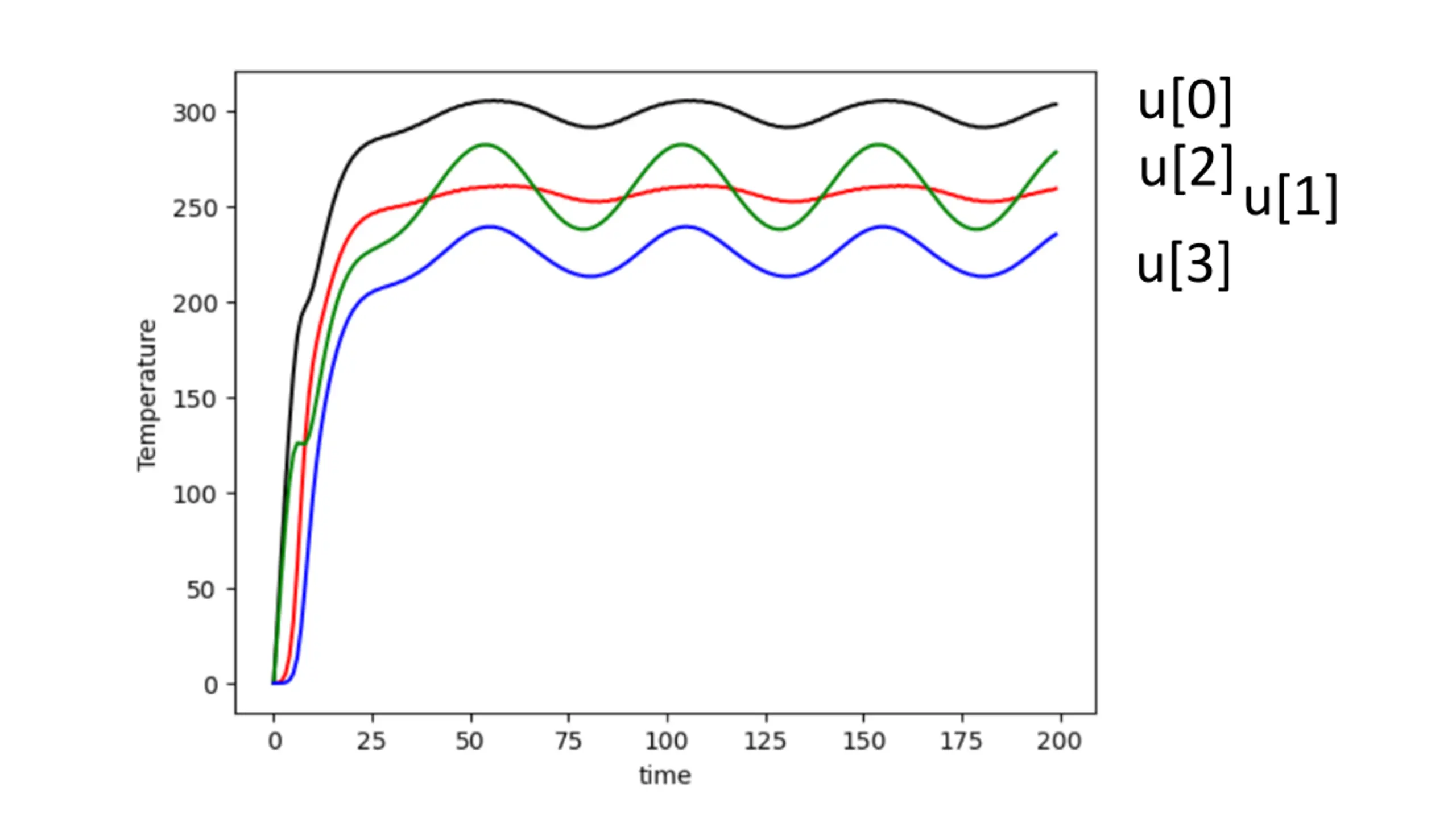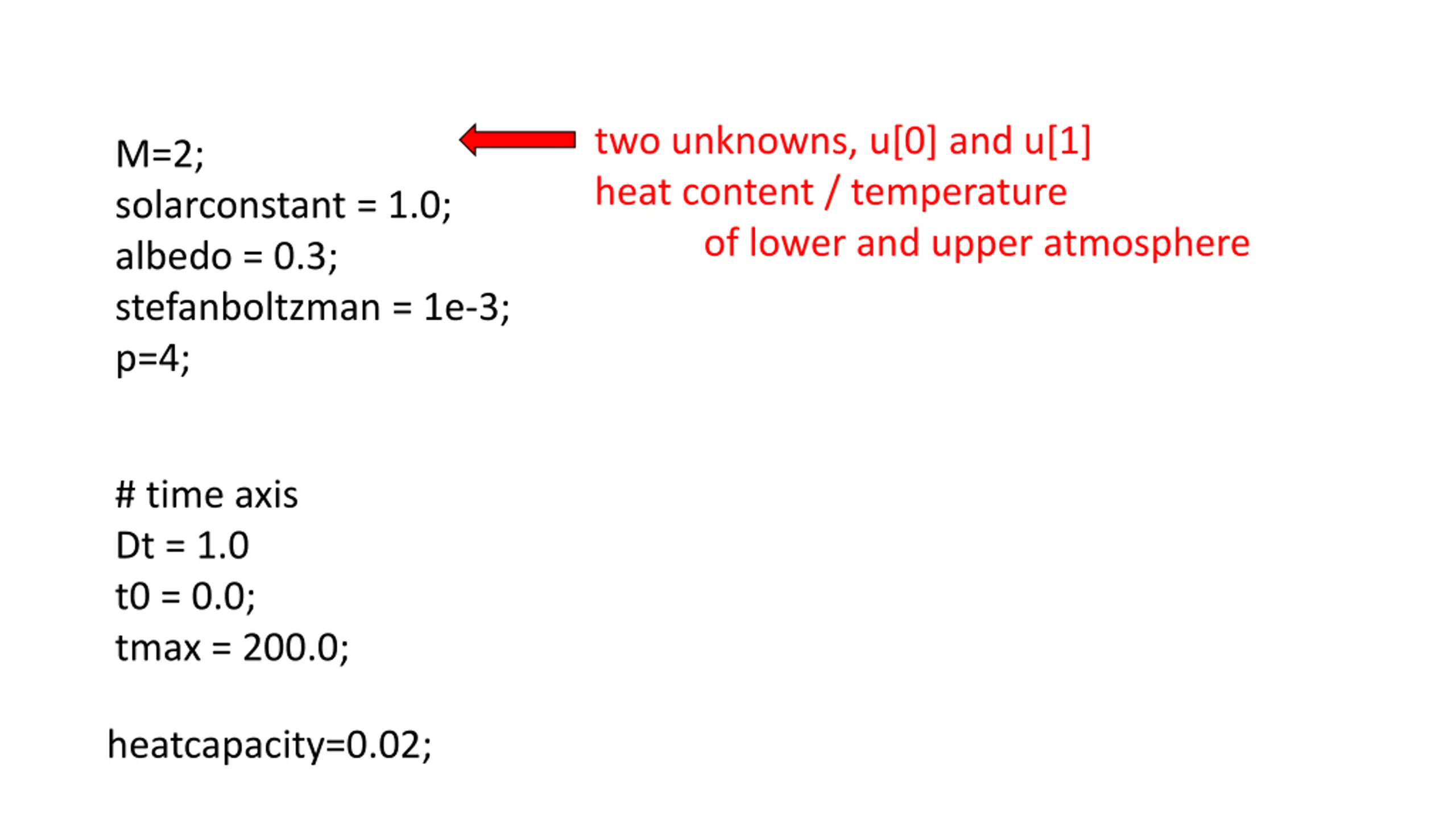 two unknowns, u[0] and u[1] heat content / temperature of lower and upper atmosphere M=2; solarconstant = 1.0; albedo = 0.3; stefanboltzman = 1e-3; p=4; # time axis Dt = 1.0 t0 = 0.0; tmax = 200.0; heatcapacity=0.02;