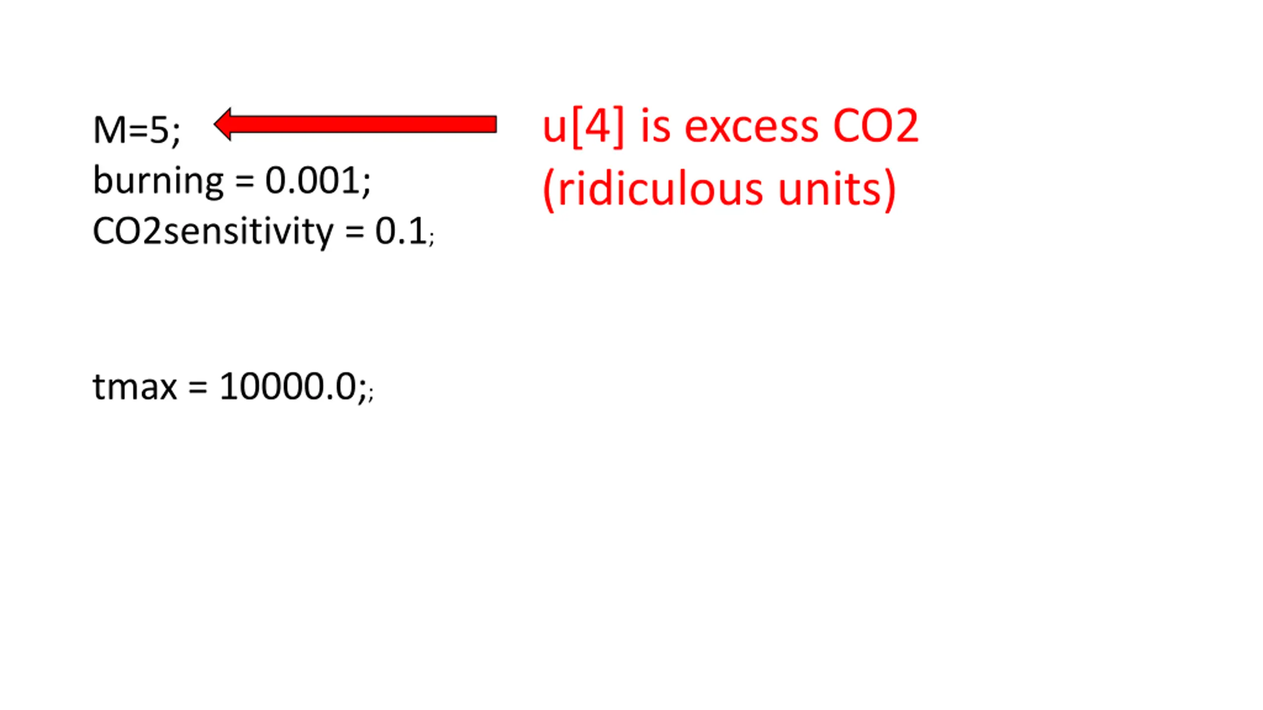 u[4] is excess CO2 (ridiculous units) M=5; burning = 0.001; CO2sensitivity = 0.1; tmax = 10000.0;;