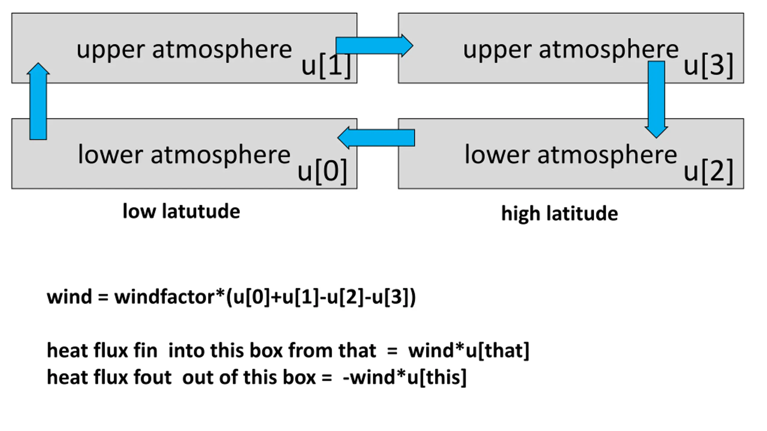 upper atmosphere upper atmosphere u[1] u[3] lower atmosphere lower atmosphere u[0] u[2] low latutude high latitude wind = windfactor*(u[0]+u[1]-u[2]-u[3]) heat flux fin into this box from that = wind*u[that] heat flux fout out of this box = -wind*u[this]