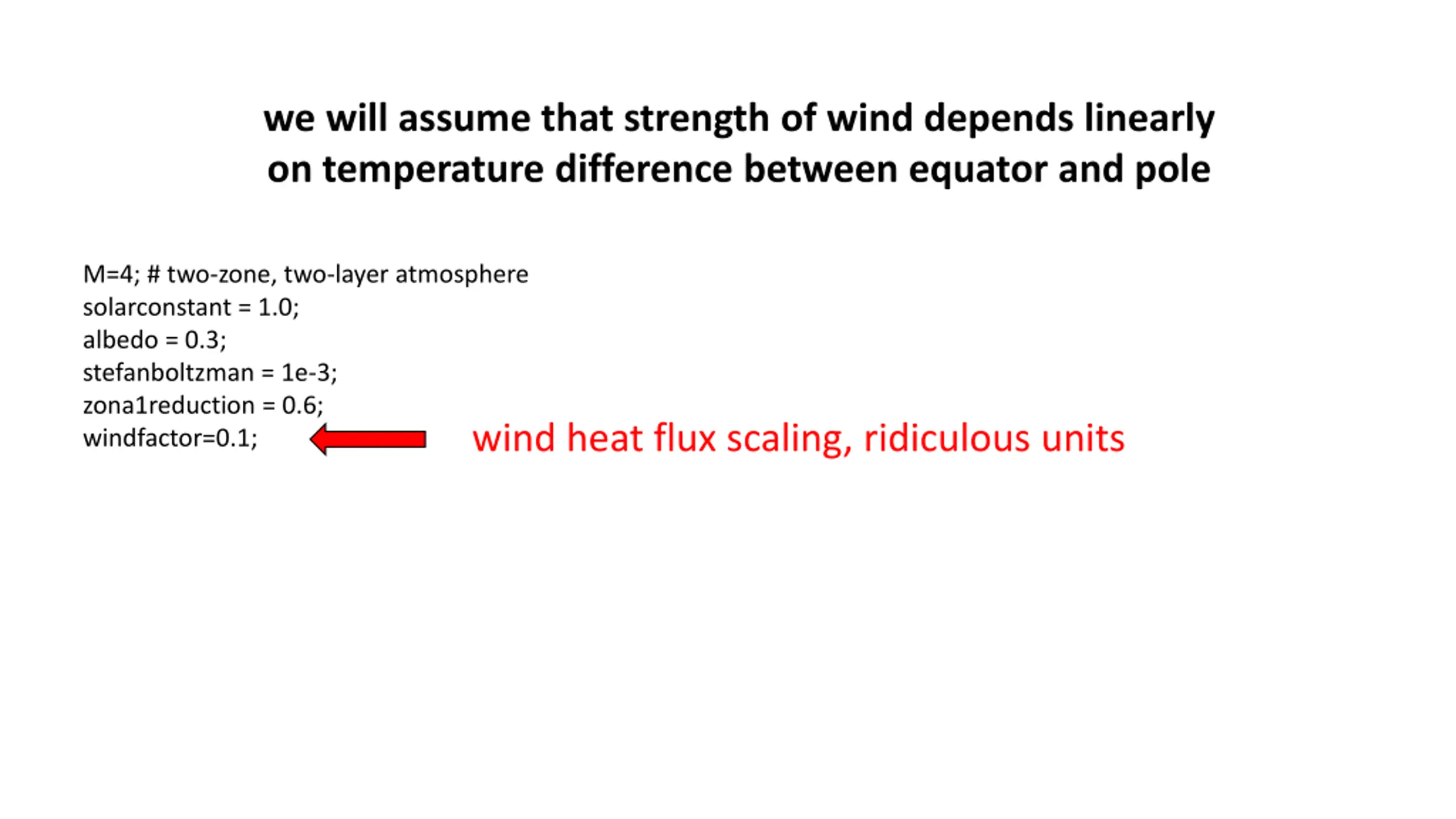 we will assume that strength of wind depends linearly on temperature difference between equator and pole M=4; # two-zone, two-layer atmosphere solarconstant = 1.0; albedo = 0.3; stefanboltzman = 1e-3; zona1reduction = 0.6; windfactor=0.1; wind heat flux scaling, ridiculous units