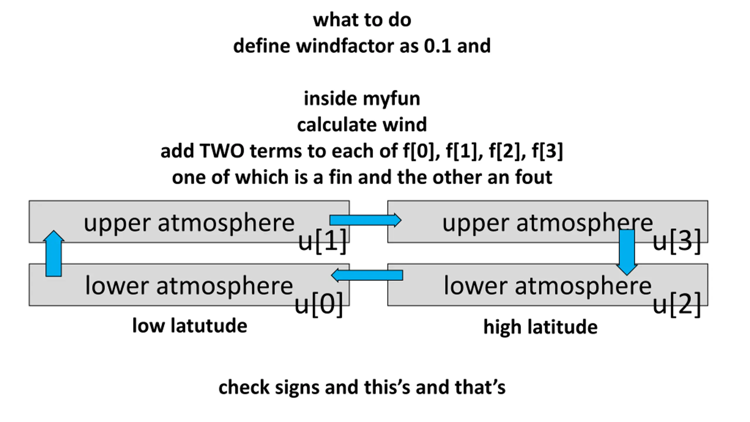what to do define windfactor as 0.1 and inside myfun calculate wind add TWO terms to each of f[0], f[1], f[2], f[3] one of which is a fin and the other an fout upper atmosphere upper atmosphere u[1] u[3] lower atmosphere lower atmosphere u[0] u[2] low latutude high latitude check signs and this s and that s