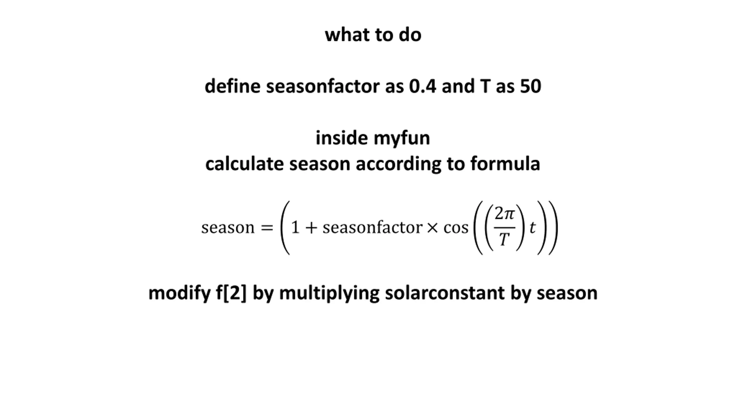 what to do define seasonfactor as 0.4 and T as 50 inside myfun calculate season according to formula 2? ? season = 1 + seasonfactor cos ? modify f[2] by multiplying solarconstant by season