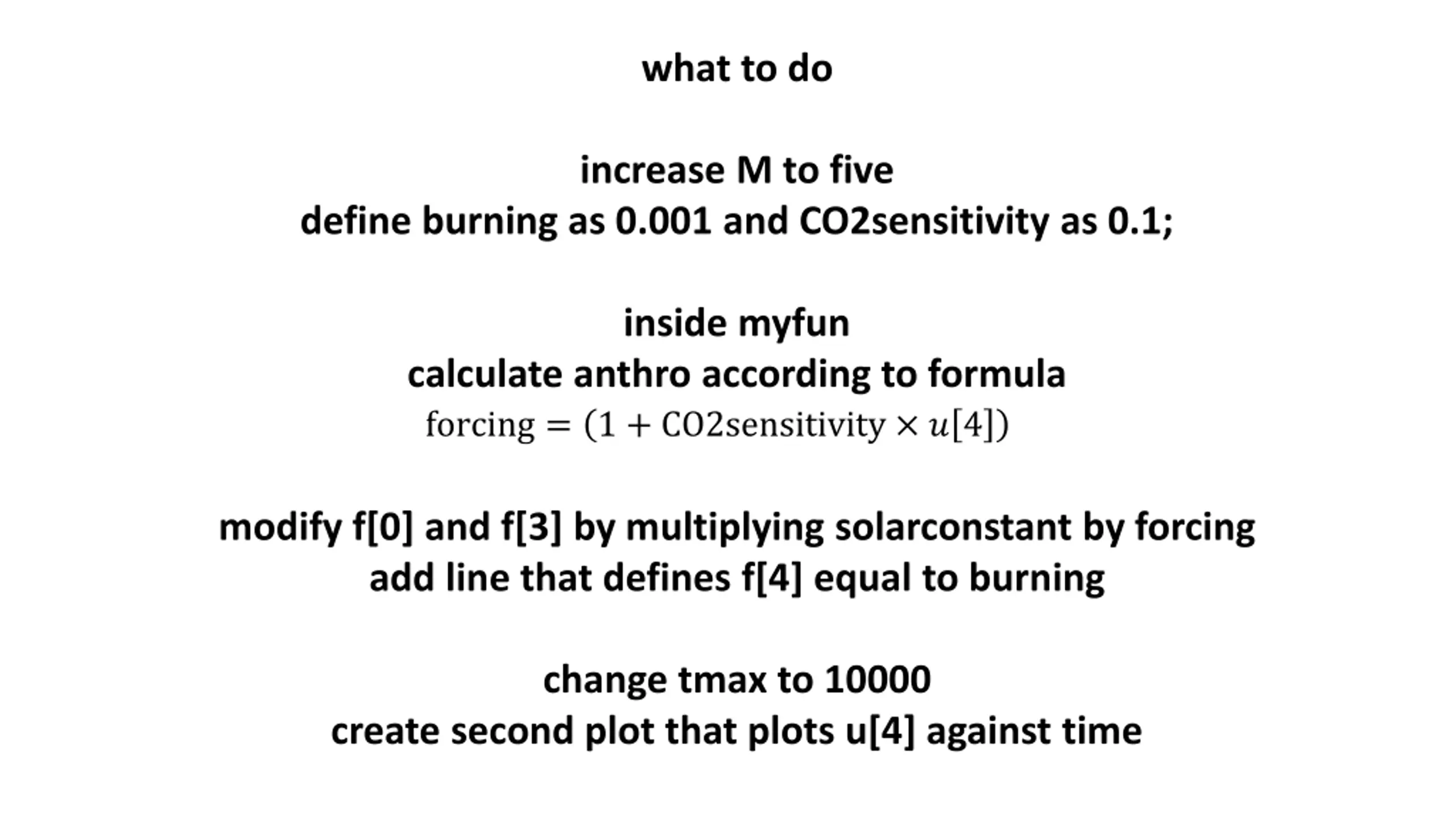 what to do increase M to five define burning as 0.001 and CO2sensitivity as 0.1; inside myfun calculate anthro according to formula forcing = 1 + CO2sensitivity ? 4 modify f[0] and f[3] by multiplying solarconstant by forcing add line that defines f[4] equal to burning change tmax to 10000 create second plot that plots u[4] against time