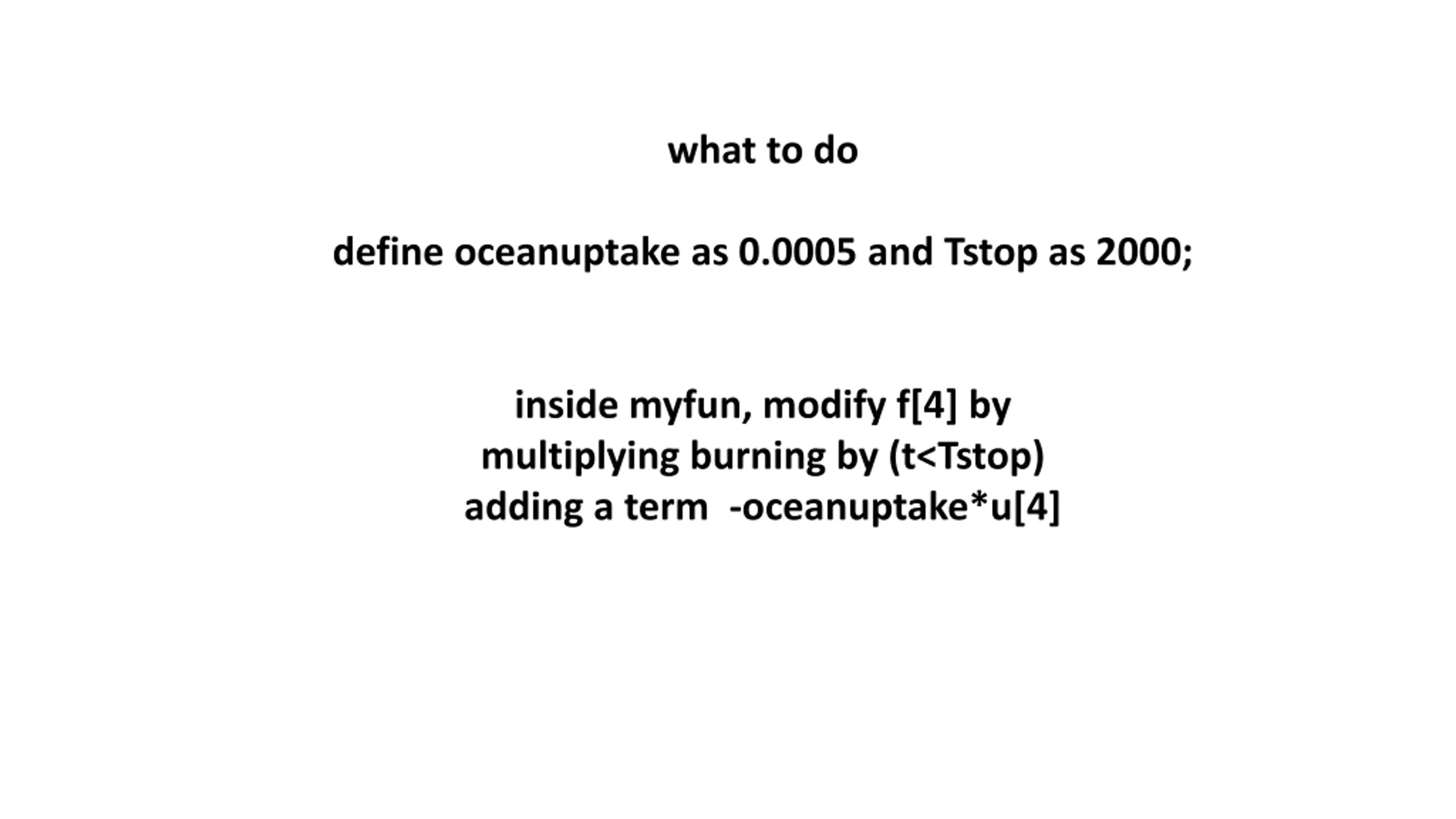 what to do define oceanuptake as 0.0005 and Tstop as 2000; inside myfun, modify f[4] by multiplying burning by (t<Tstop) adding a term -oceanuptake*u[4]