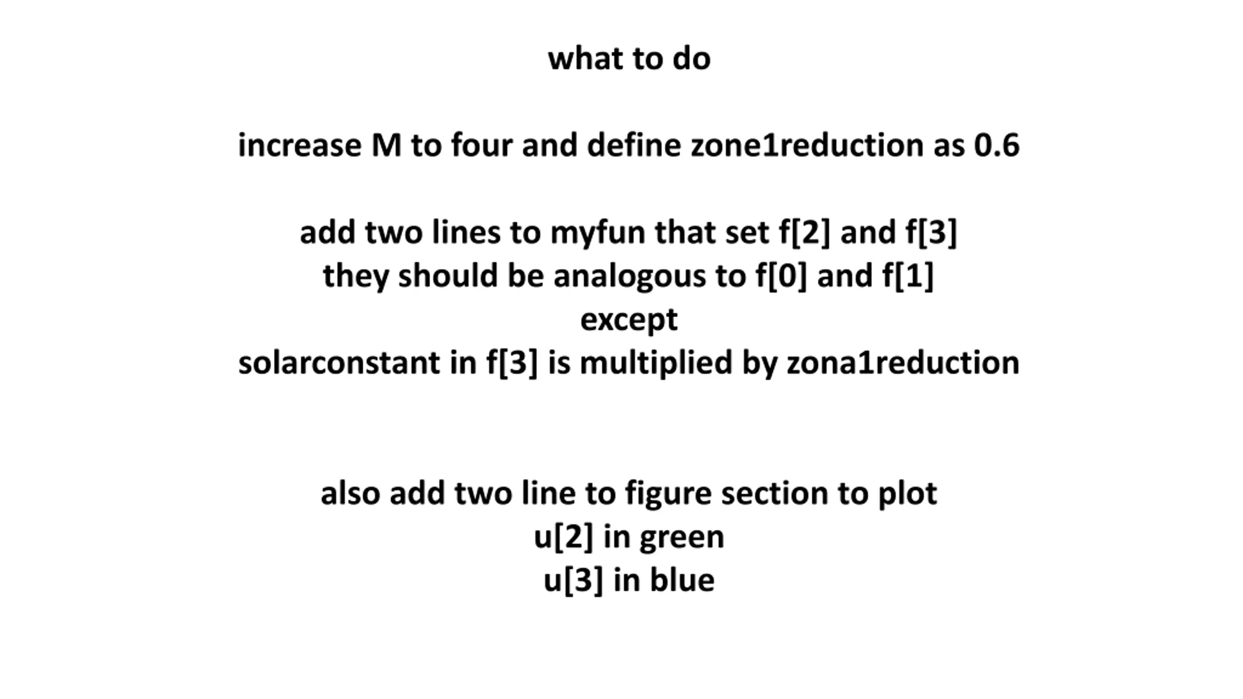 what to do increase M to four and define zone1reduction as 0.6 add two lines to myfun that set f[2] and f[3] they should be analogous to f[0] and f[1] except solarconstant in f[3] is multiplied by zona1reduction also add two line to figure section to plot u[2] in green u[3] in blue