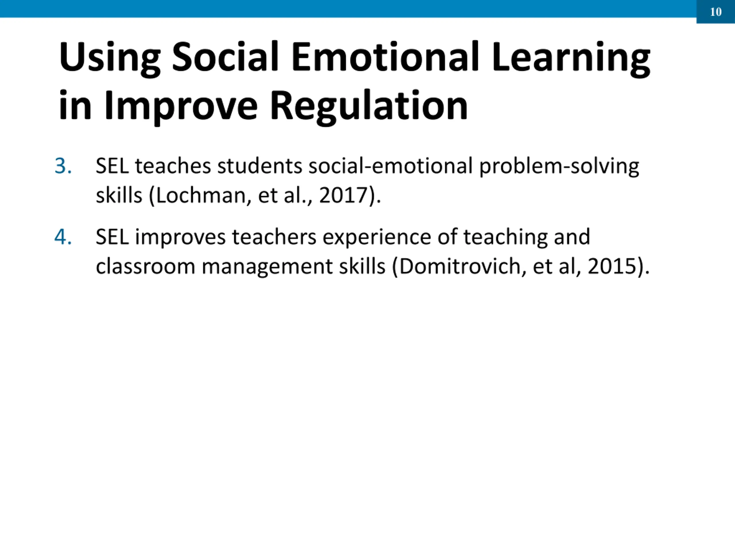 10 Using Social Emotional Learning in Improve Regulation 3. SEL teaches students social-emotional problem-solving skills (Lochman, et al., 2017). 4. SEL improves teachers experience of teaching and classroom management skills (Domitrovich, et al, 2015).
