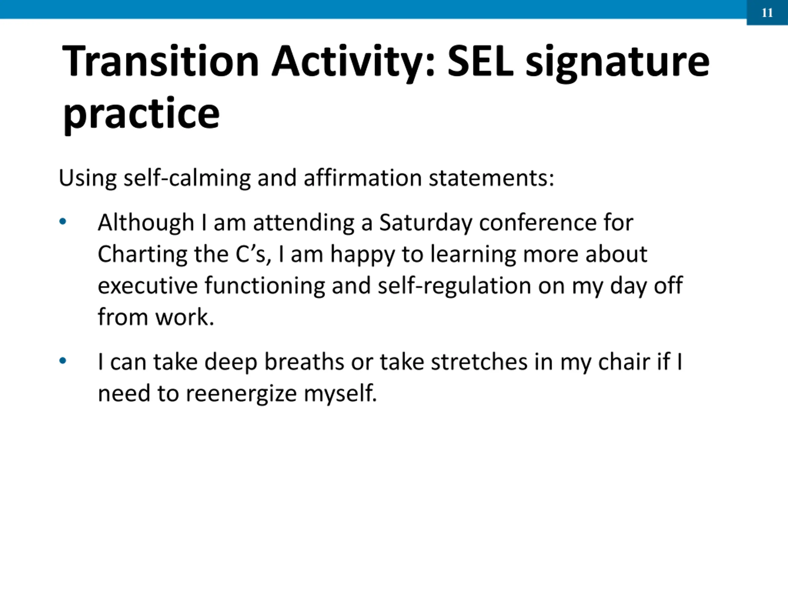 11 Transition Activity: SEL signature practice Using self-calming and affirmation statements: Although I am attending a Saturday conference for Charting the C s, I am happy to learning more about executive functioning and self-regulation on my day off from work. I can take deep breaths or take stretches in my chair if I need to reenergize myself.