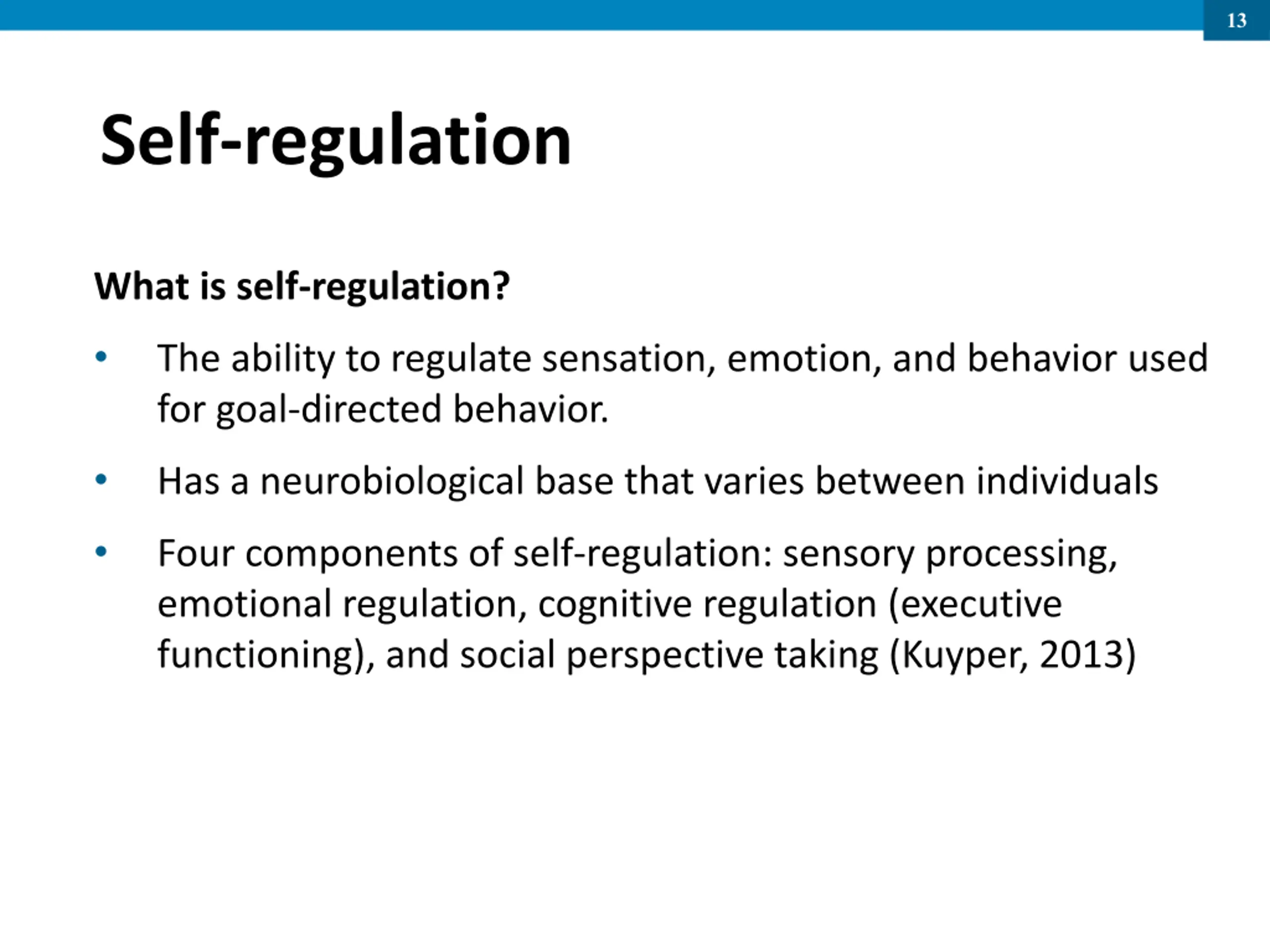 13 Self-regulation What is self-regulation? The ability to regulate sensation, emotion, and behavior used for goal-directed behavior. Has a neurobiological base that varies between individuals Four components of self-regulation: sensory processing, emotional regulation, cognitive regulation (executive functioning), and social perspective taking (Kuyper, 2013)