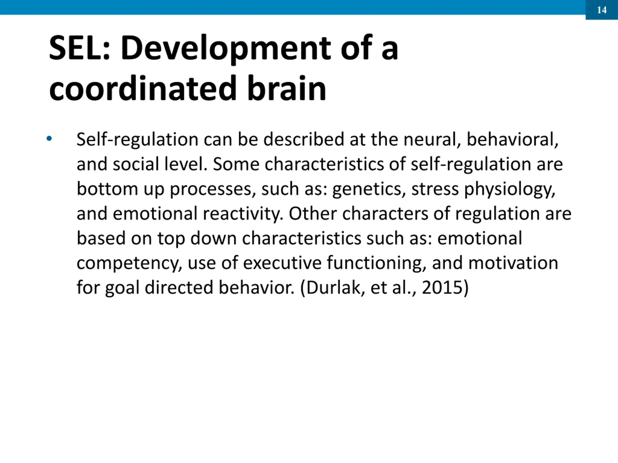 14 SEL: Development of a coordinated brain Self-regulation can be described at the neural, behavioral, and social level. Some characteristics of self-regulation are bottom up processes, such as: genetics, stress physiology, and emotional reactivity. Other characters of regulation are based on top down characteristics such as: emotional competency, use of executive functioning, and motivation for goal directed behavior. (Durlak, et al., 2015)