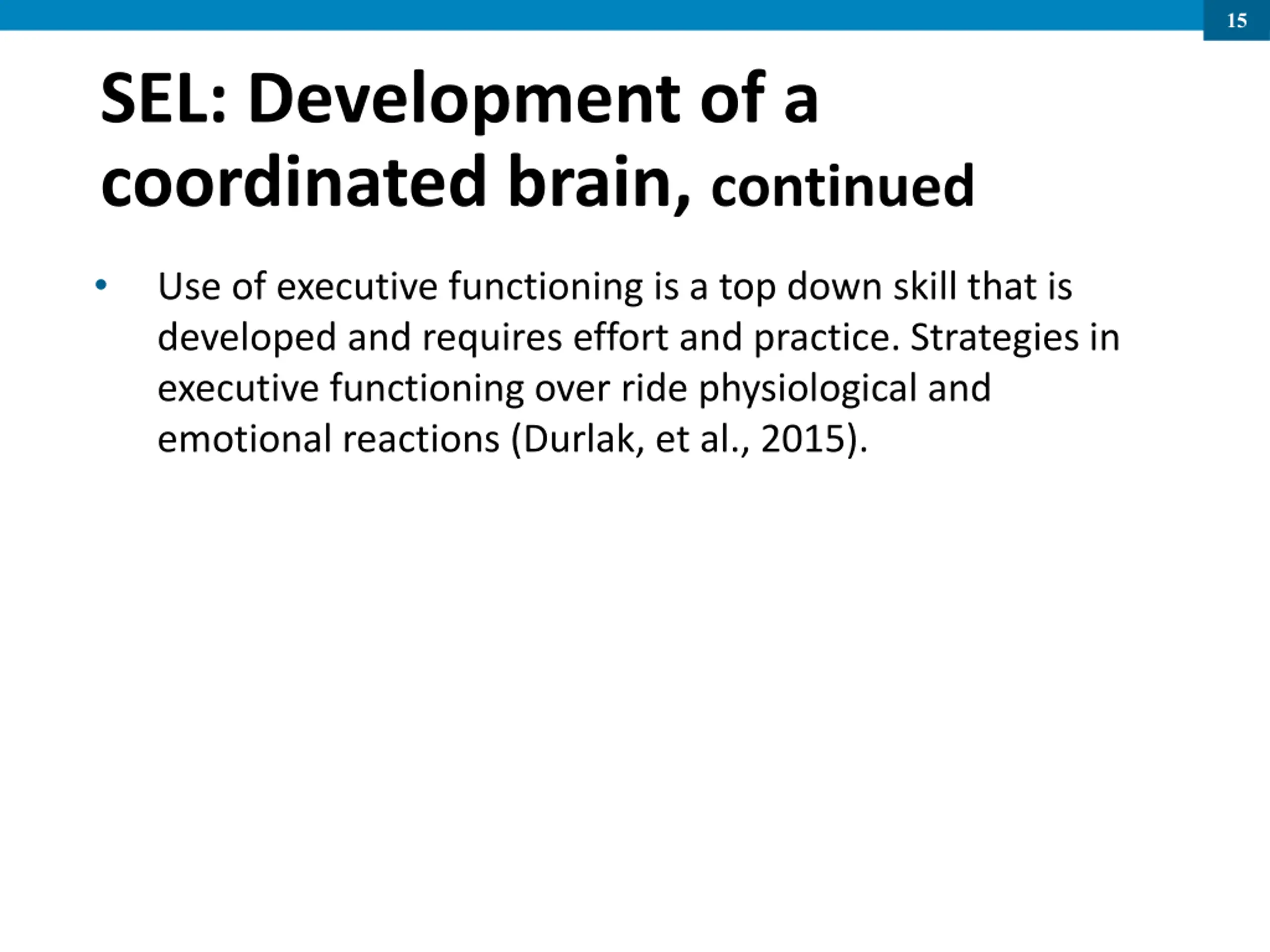 15 SEL: Development of a coordinated brain, continued Use of executive functioning is a top down skill that is developed and requires effort and practice. Strategies in executive functioning over ride physiological and emotional reactions (Durlak, et al., 2015).