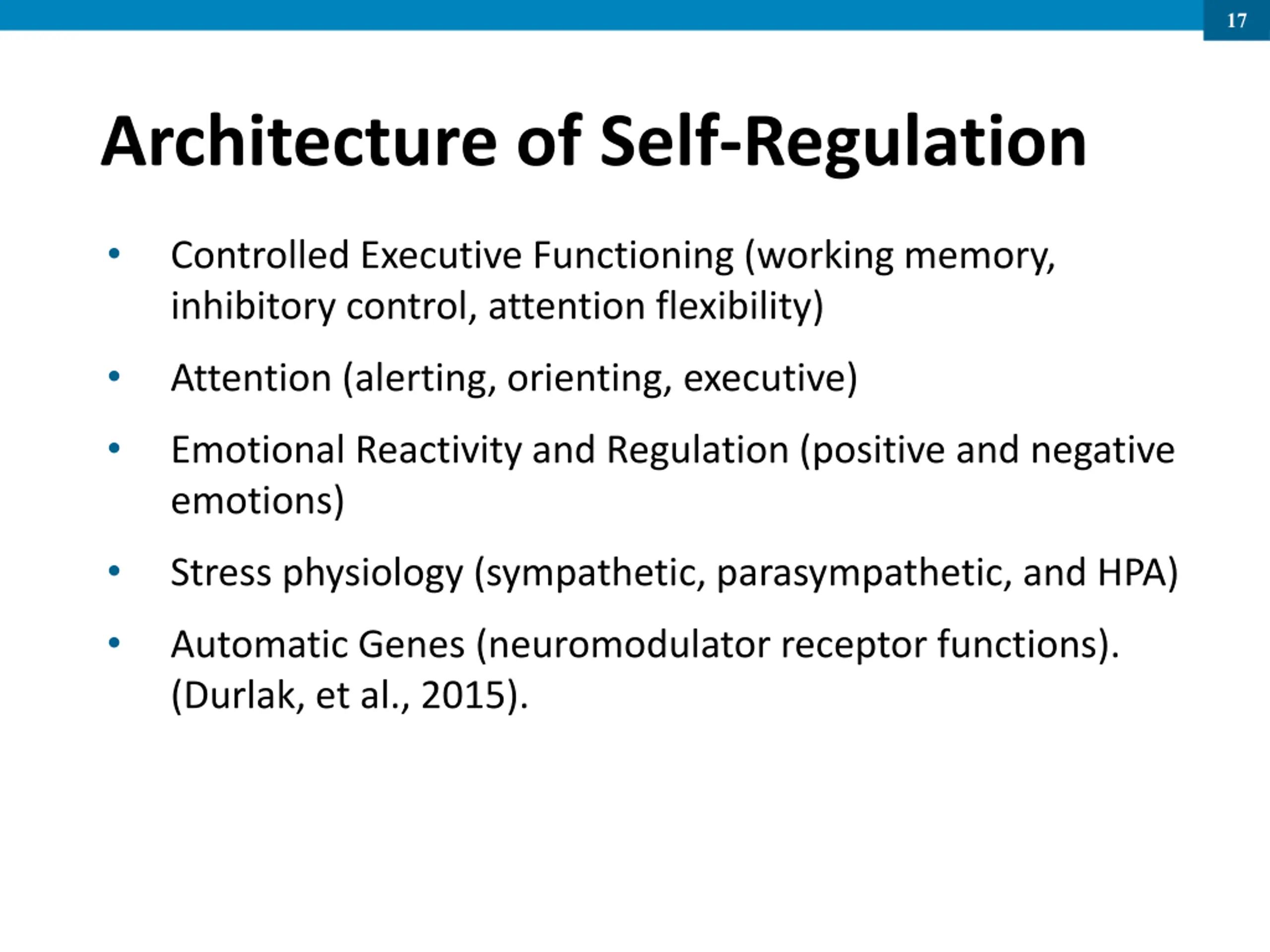 17 Architecture of Self-Regulation Controlled Executive Functioning (working memory, inhibitory control, attention flexibility) Attention (alerting, orienting, executive) Emotional Reactivity and Regulation (positive and negative emotions) Stress physiology (sympathetic, parasympathetic, and HPA) Automatic Genes (neuromodulator receptor functions). (Durlak, et al., 2015).