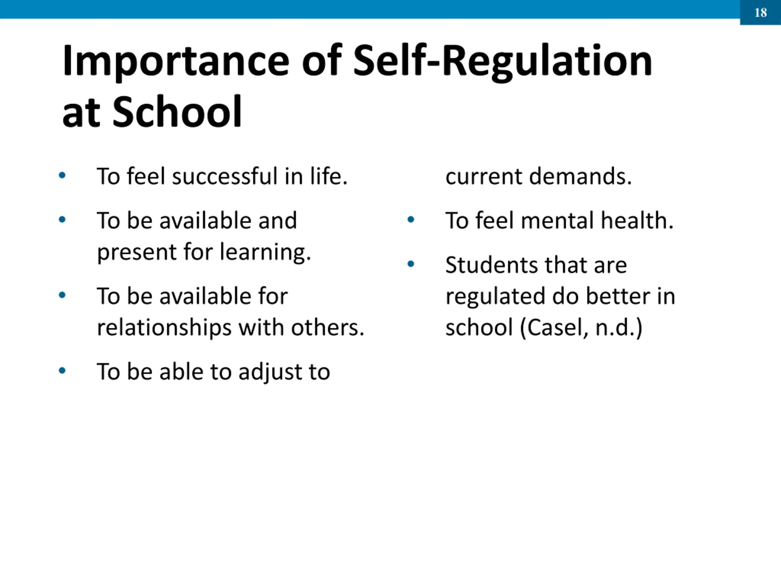18 Importance of Self-Regulation at School To feel successful in life. current demands. To be available and present for learning. To feel mental health. Students that are regulated do better in school (Casel, n.d.) To be available for relationships with others. To be able to adjust to
