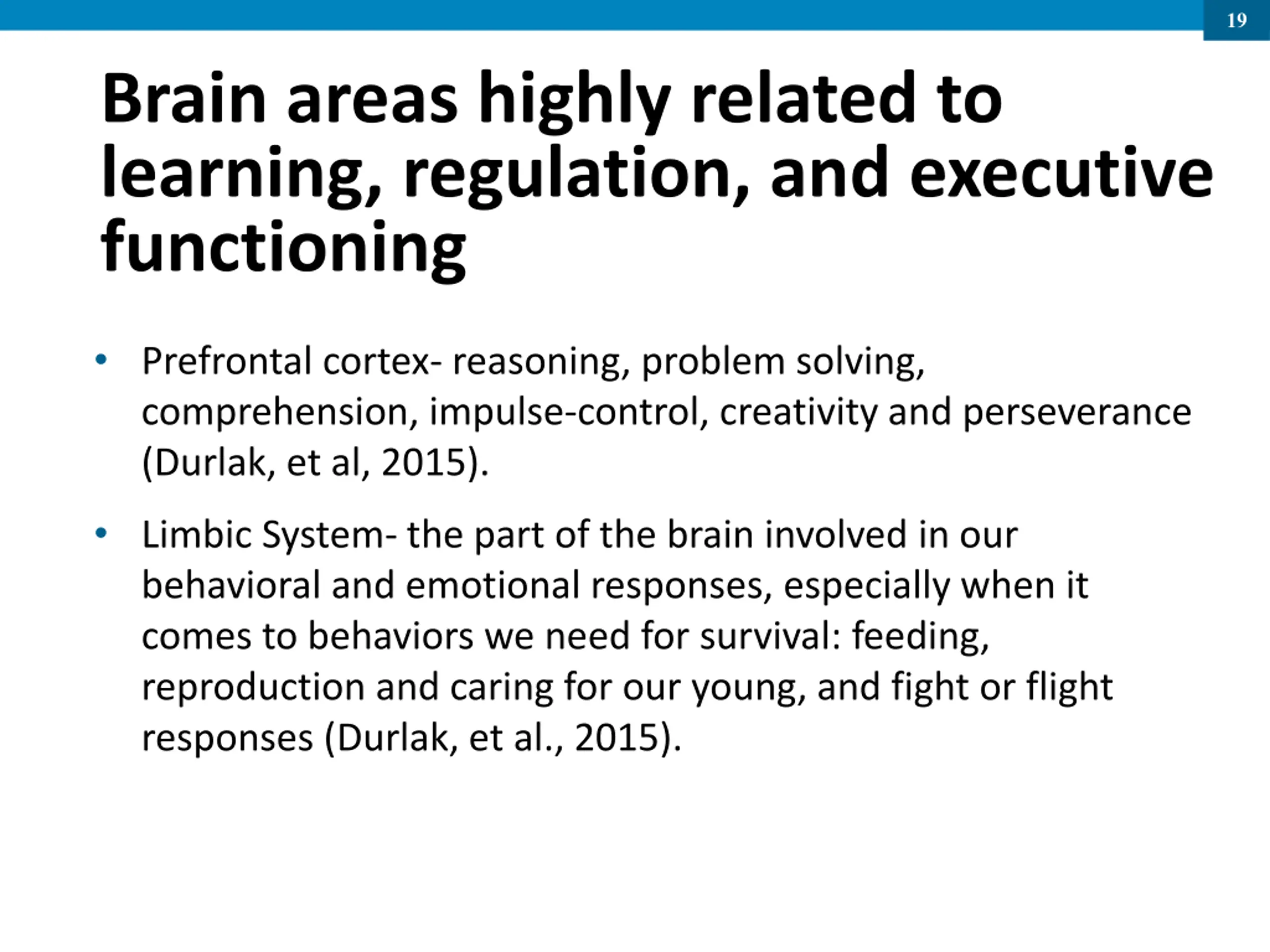 19 Brain areas highly related to learning, regulation, and executive functioning Prefrontal cortex- reasoning, problem solving, comprehension, impulse-control, creativity and perseverance (Durlak, et al, 2015). Limbic System- the part of the brain involved in our behavioral and emotional responses, especially when it comes to behaviors we need for survival: feeding, reproduction and caring for our young, and fight or flight responses (Durlak, et al., 2015).