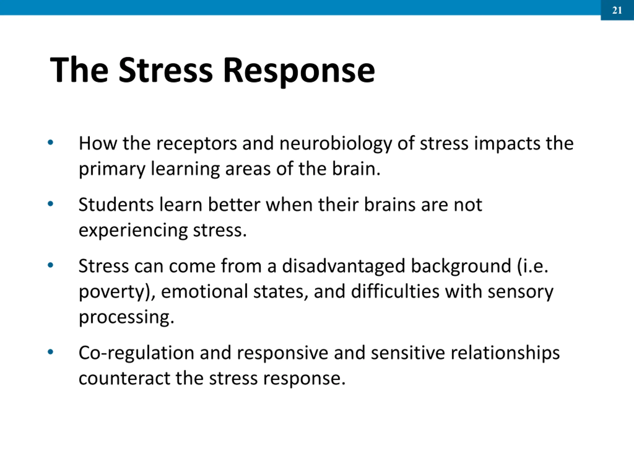 21 The Stress Response How the receptors and neurobiology of stress impacts the primary learning areas of the brain. Students learn better when their brains are not experiencing stress. Stress can come from a disadvantaged background (i.e. poverty), emotional states, and difficulties with sensory processing. Co-regulation and responsive and sensitive relationships counteract the stress response.