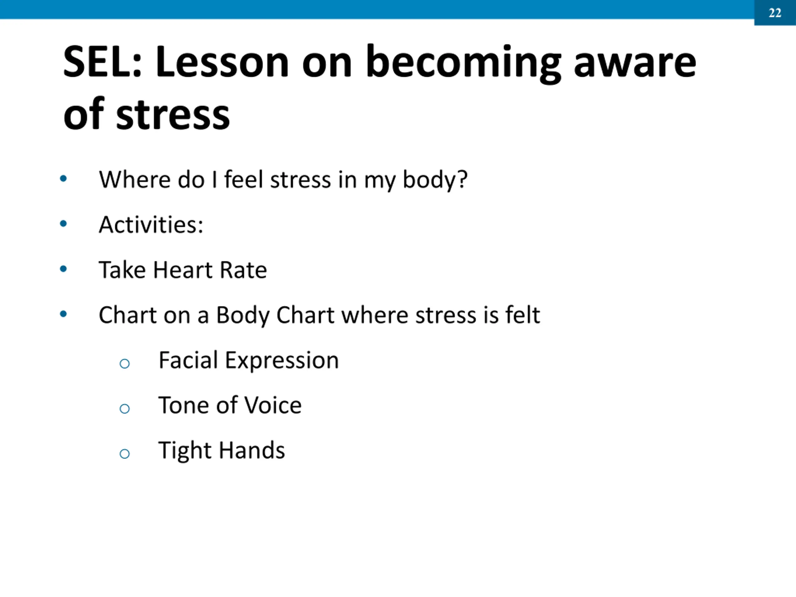 22 SEL: Lesson on becoming aware of stress Where do I feel stress in my body? Activities: Take Heart Rate Chart on a Body Chart where stress is felt Facial Expression o Tone of Voice o Tight Hands o