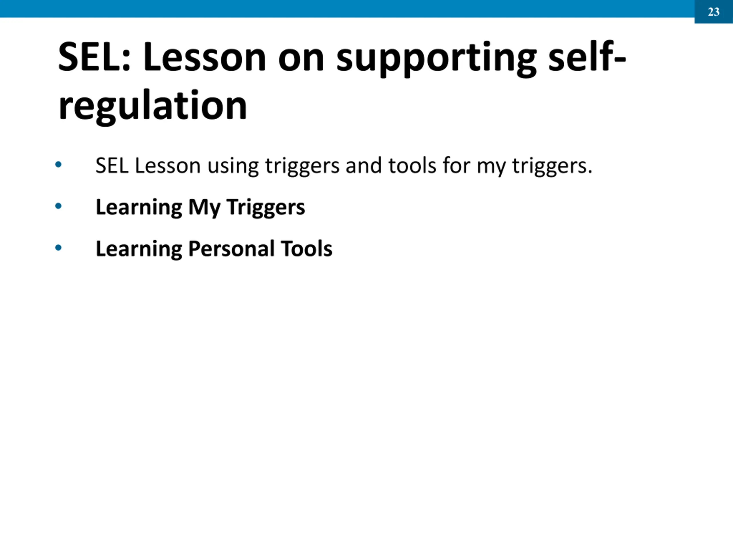 23 SEL: Lesson on supporting self- regulation SEL Lesson using triggers and tools for my triggers. Learning My Triggers Learning Personal Tools