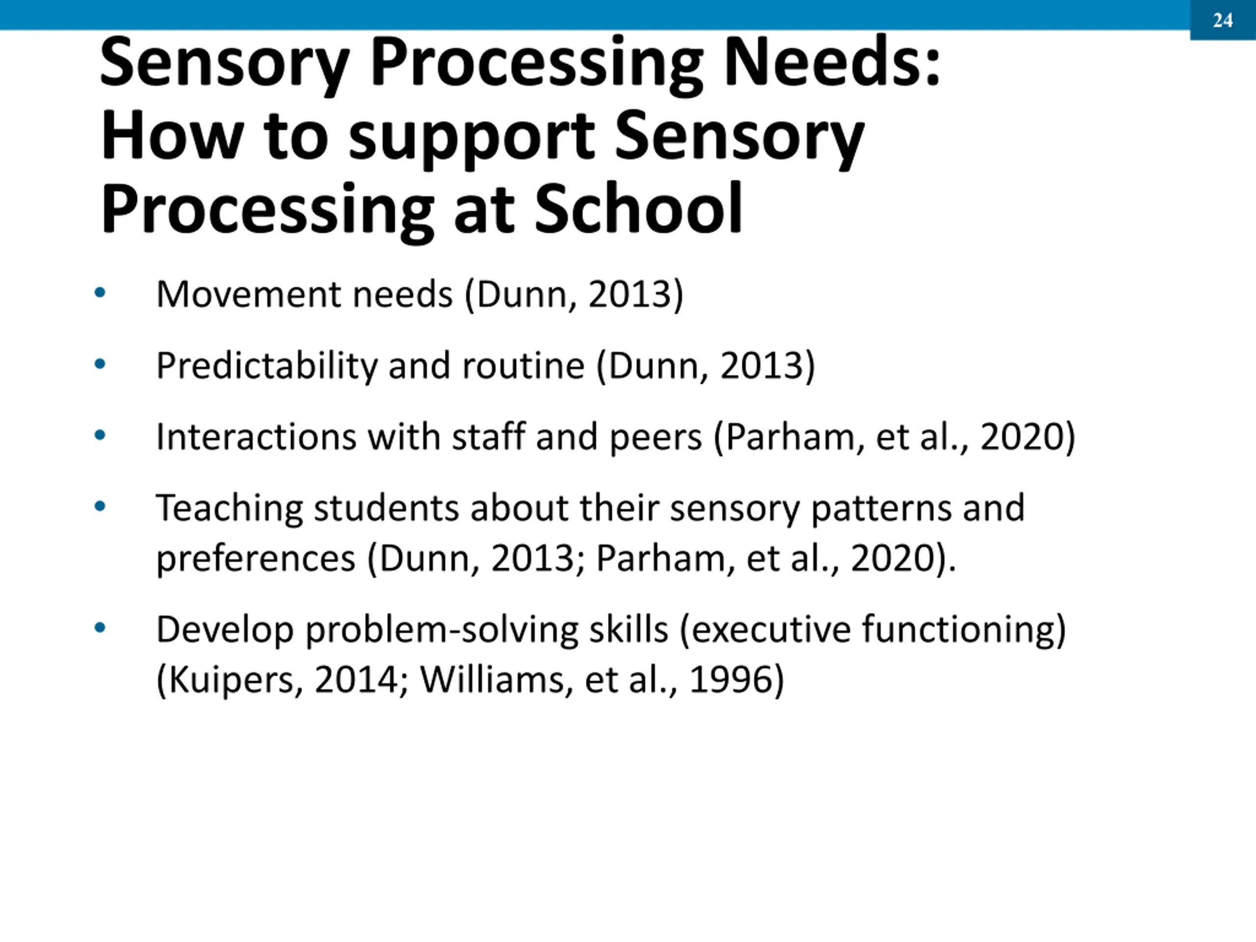 24 Sensory Processing Needs: How to support Sensory Processing at School Movement needs (Dunn, 2013) Predictability and routine (Dunn, 2013) Interactions with staff and peers (Parham, et al., 2020) Teaching students about their sensory patterns and preferences (Dunn, 2013; Parham, et al., 2020). Develop problem-solving skills (executive functioning) (Kuipers, 2014; Williams, et al., 1996)