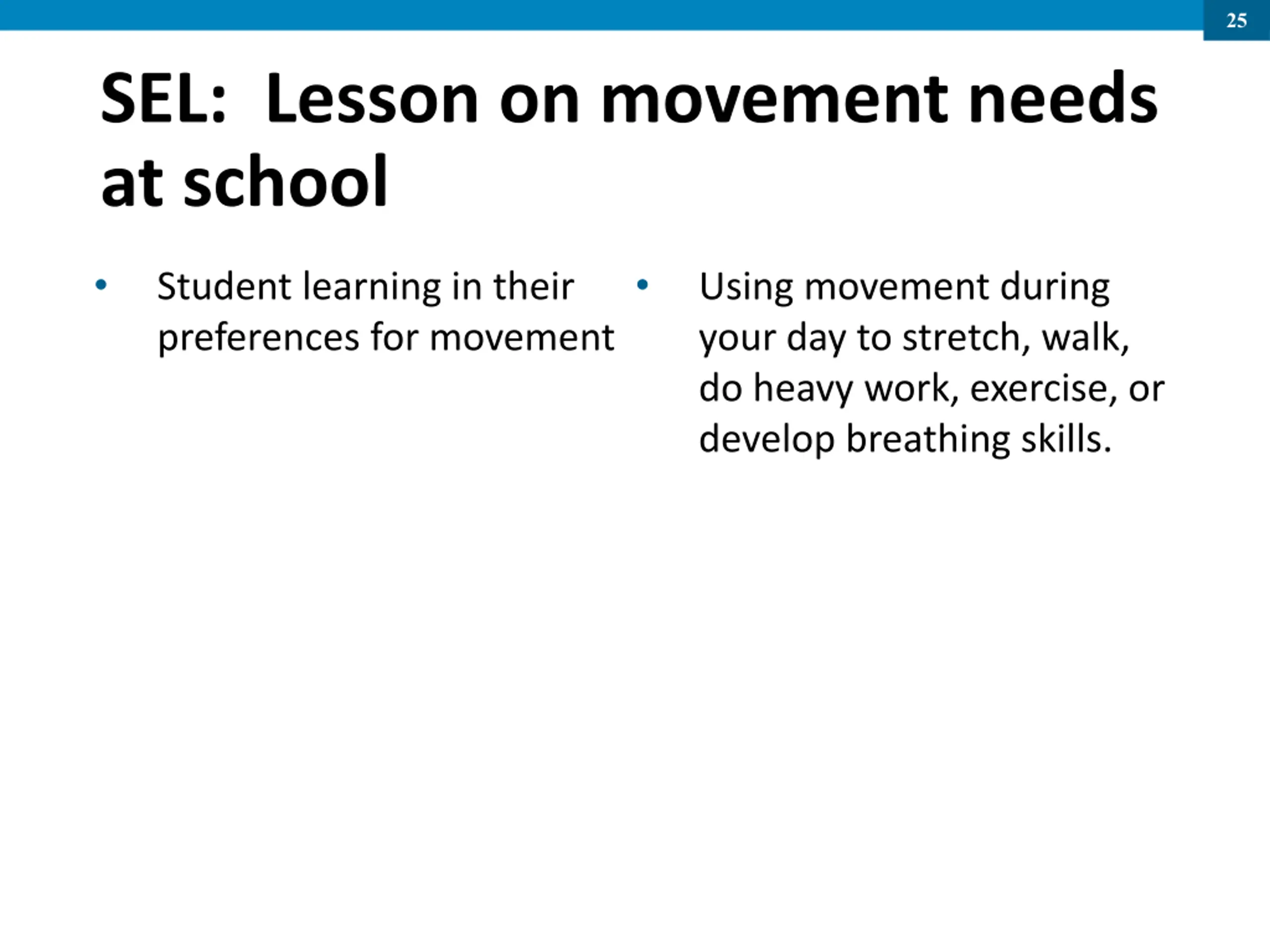 25 SEL: Lesson on movement needs at school Student learning in their preferences for movement Using movement during your day to stretch, walk, do heavy work, exercise, or develop breathing skills.