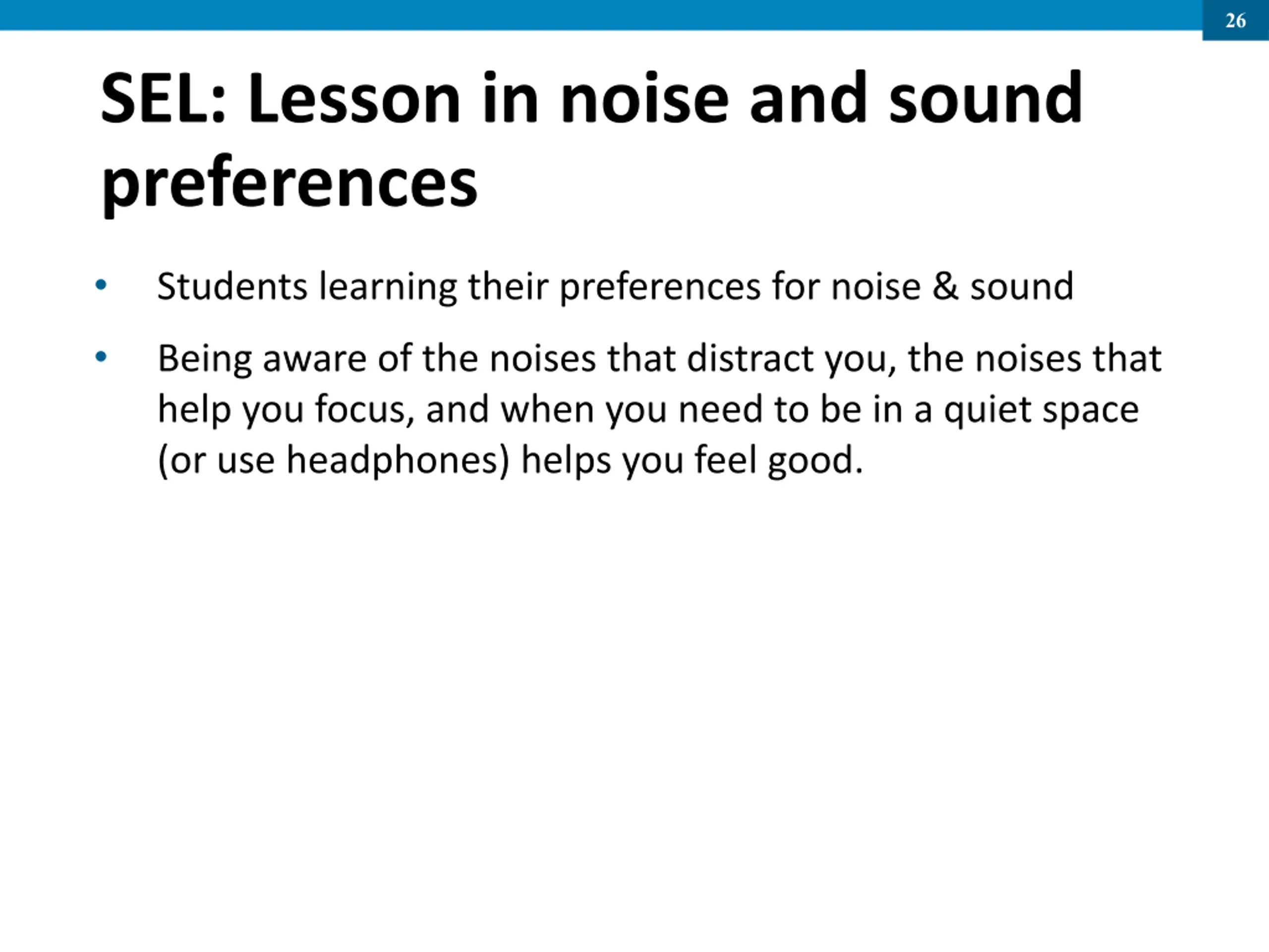 26 SEL: Lesson in noise and sound preferences Students learning their preferences for noise & sound Being aware of the noises that distract you, the noises that help you focus, and when you need to be in a quiet space (or use headphones) helps you feel good.