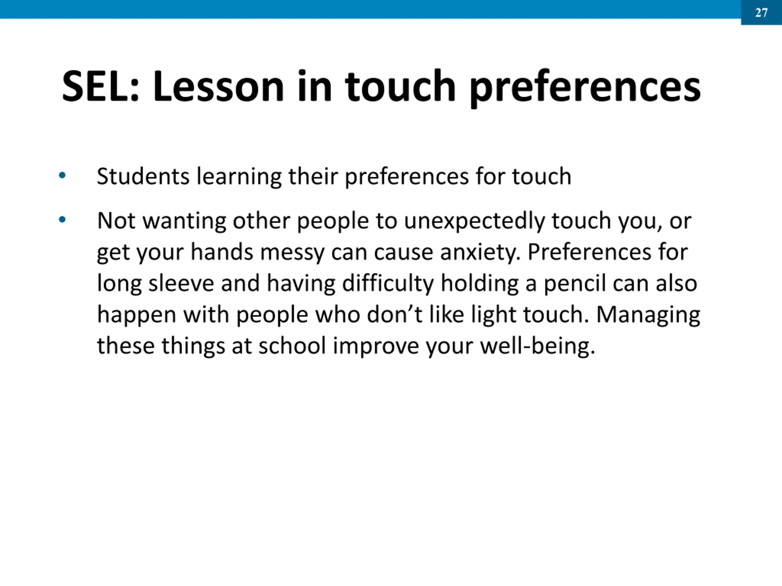 27 SEL: Lesson in touch preferences Students learning their preferences for touch Not wanting other people to unexpectedly touch you, or get your hands messy can cause anxiety. Preferences for long sleeve and having difficulty holding a pencil can also happen with people who don t like light touch. Managing these things at school improve your well-being.