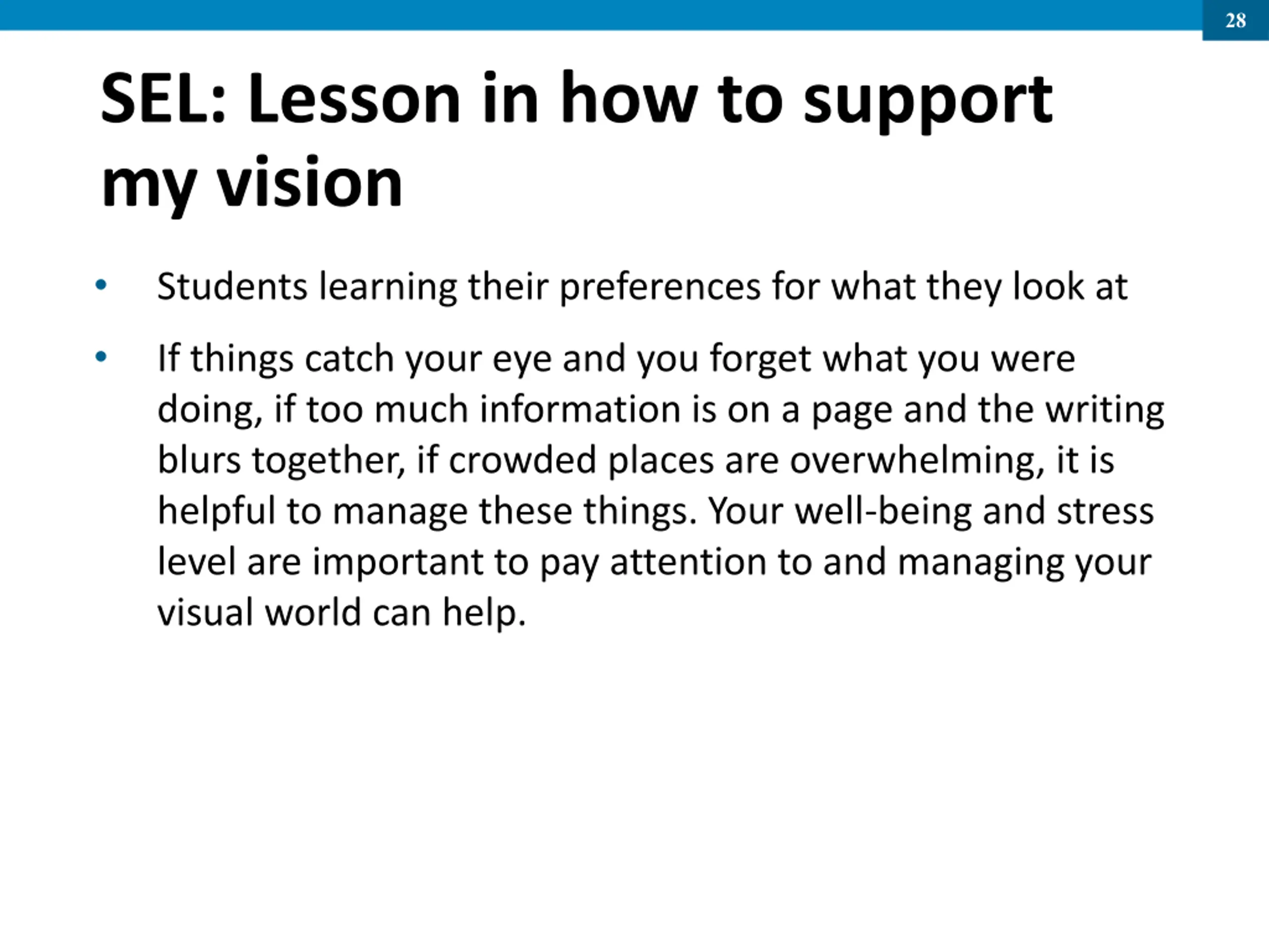 28 SEL: Lesson in how to support my vision Students learning their preferences for what they look at If things catch your eye and you forget what you were doing, if too much information is on a page and the writing blurs together, if crowded places are overwhelming, it is helpful to manage these things. Your well-being and stress level are important to pay attention to and managing your visual world can help.