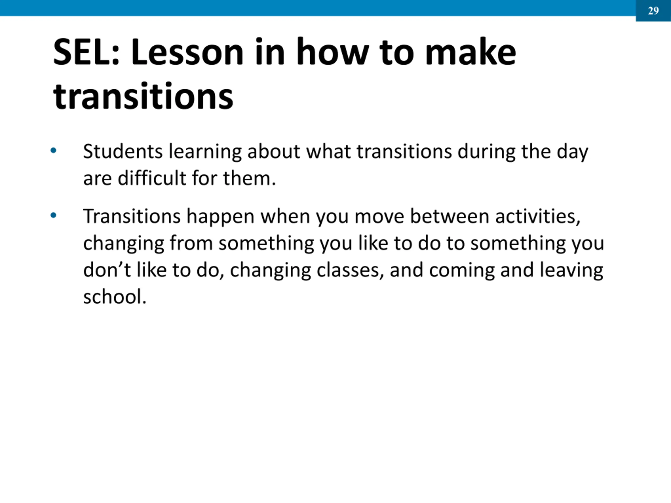29 SEL: Lesson in how to make transitions Students learning about what transitions during the day are difficult for them. Transitions happen when you move between activities, changing from something you like to do to something you don t like to do, changing classes, and coming and leaving school.