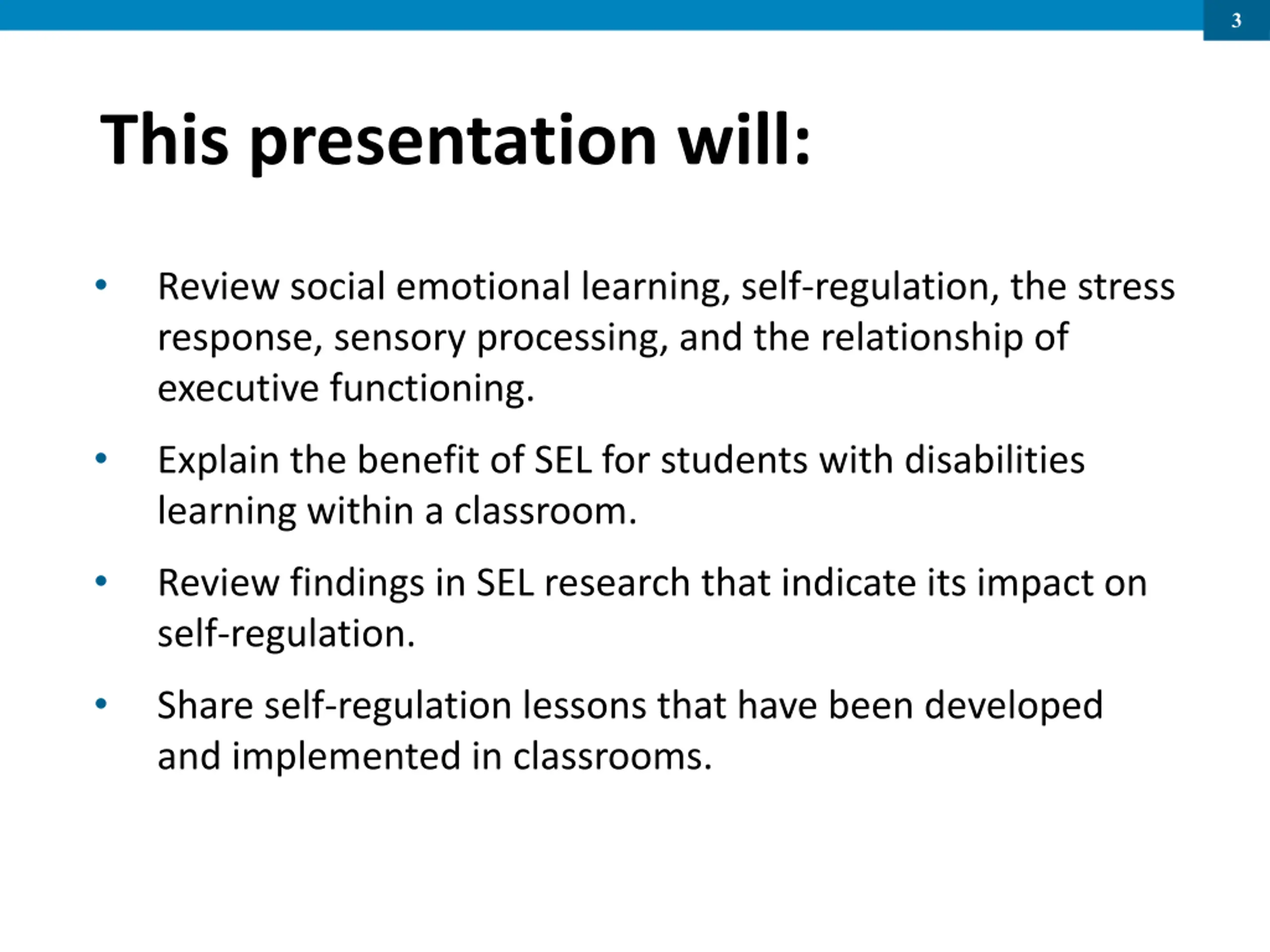 3 This presentation will: Review social emotional learning, self-regulation, the stress response, sensory processing, and the relationship of executive functioning. Explain the benefit of SEL for students with disabilities learning within a classroom. Review findings in SEL research that indicate its impact on self-regulation. Share self-regulation lessons that have been developed and implemented in classrooms.