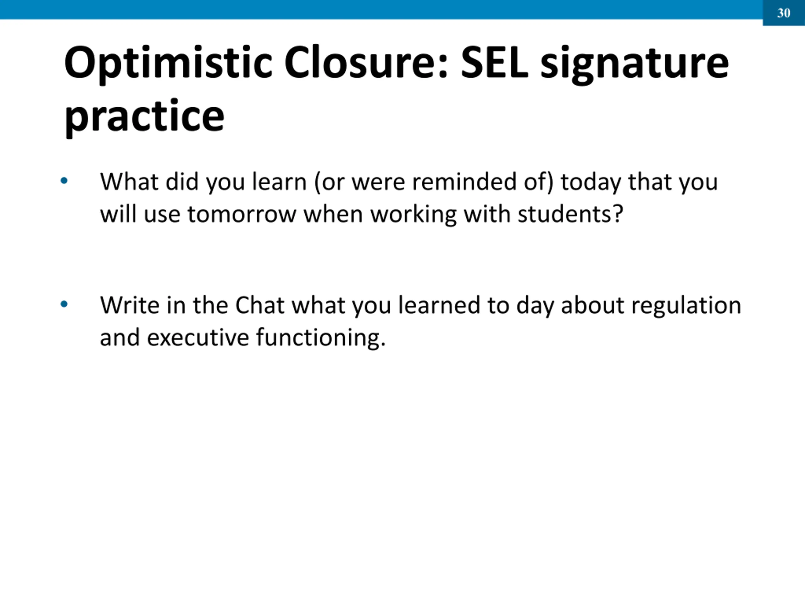 30 Optimistic Closure: SEL signature practice What did you learn (or were reminded of) today that you will use tomorrow when working with students? Write in the Chat what you learned to day about regulation and executive functioning.