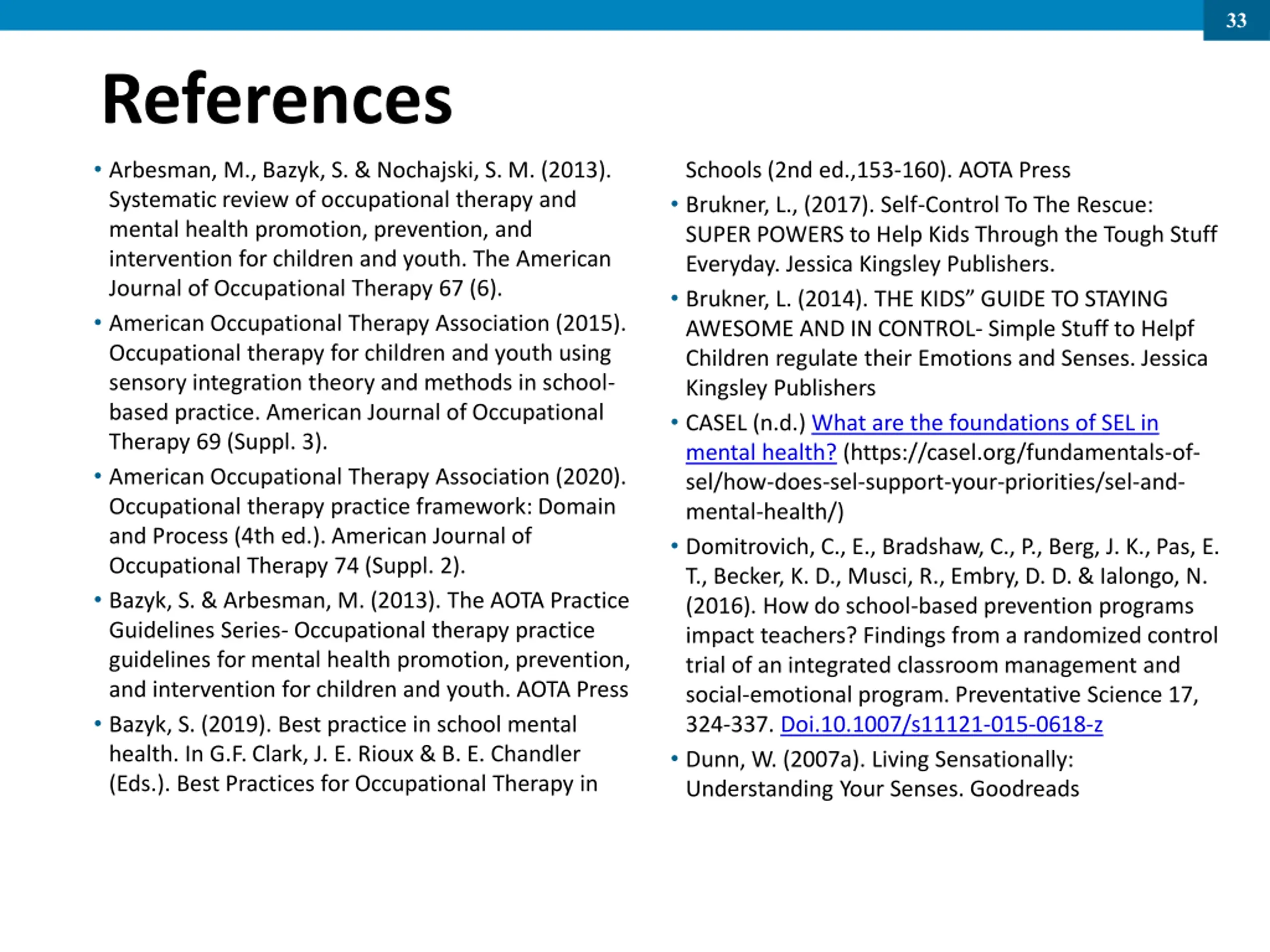 33 References Arbesman, M., Bazyk, S. & Nochajski, S. M. (2013). Systematic review of occupational therapy and mental health promotion, prevention, and intervention for children and youth. The American Journal of Occupational Therapy 67 (6). American Occupational Therapy Association (2015). Occupational therapy for children and youth using sensory integration theory and methods in school- based practice. American Journal of Occupational Therapy 69 (Suppl. 3). American Occupational Therapy Association (2020). Occupational therapy practice framework: Domain and Process (4th ed.). American Journal of Occupational Therapy 74 (Suppl. 2). Bazyk, S. & Arbesman, M. (2013). The AOTA Practice Guidelines Series- Occupational therapy practice guidelines for mental health promotion, prevention, and intervention for children and youth. AOTA Press Bazyk, S. (2019). Best practice in school mental health. In G.F. Clark, J. E. Rioux & B. E. Chandler (Eds.). Best Practices for Occupational Therapy in Schools (2nd ed.,153-160). AOTA Press Brukner, L., (2017). Self-Control To The Rescue: SUPER POWERS to Help Kids Through the Tough Stuff Everyday. Jessica Kingsley Publishers. Brukner, L. (2014). THE KIDS GUIDE TO STAYING AWESOME AND IN CONTROL- Simple Stuff to Helpf Children regulate their Emotions and Senses. Jessica Kingsley Publishers CASEL (n.d.) What are the foundations of SEL in mental health? (https://casel.org/fundamentals-of- sel/how-does-sel-support-your-priorities/sel-and- mental-health/) Domitrovich, C., E., Bradshaw, C., P., Berg, J. K., Pas, E. T., Becker, K. D., Musci, R., Embry, D. D. & Ialongo, N. (2016). How do school-based prevention programs impact teachers? Findings from a randomized control trial of an integrated classroom management and social-emotional program. Preventative Science 17, 324-337. Doi.10.1007/s11121-015-0618-z Dunn, W. (2007a). Living Sensationally: Understanding Your Senses. Goodreads