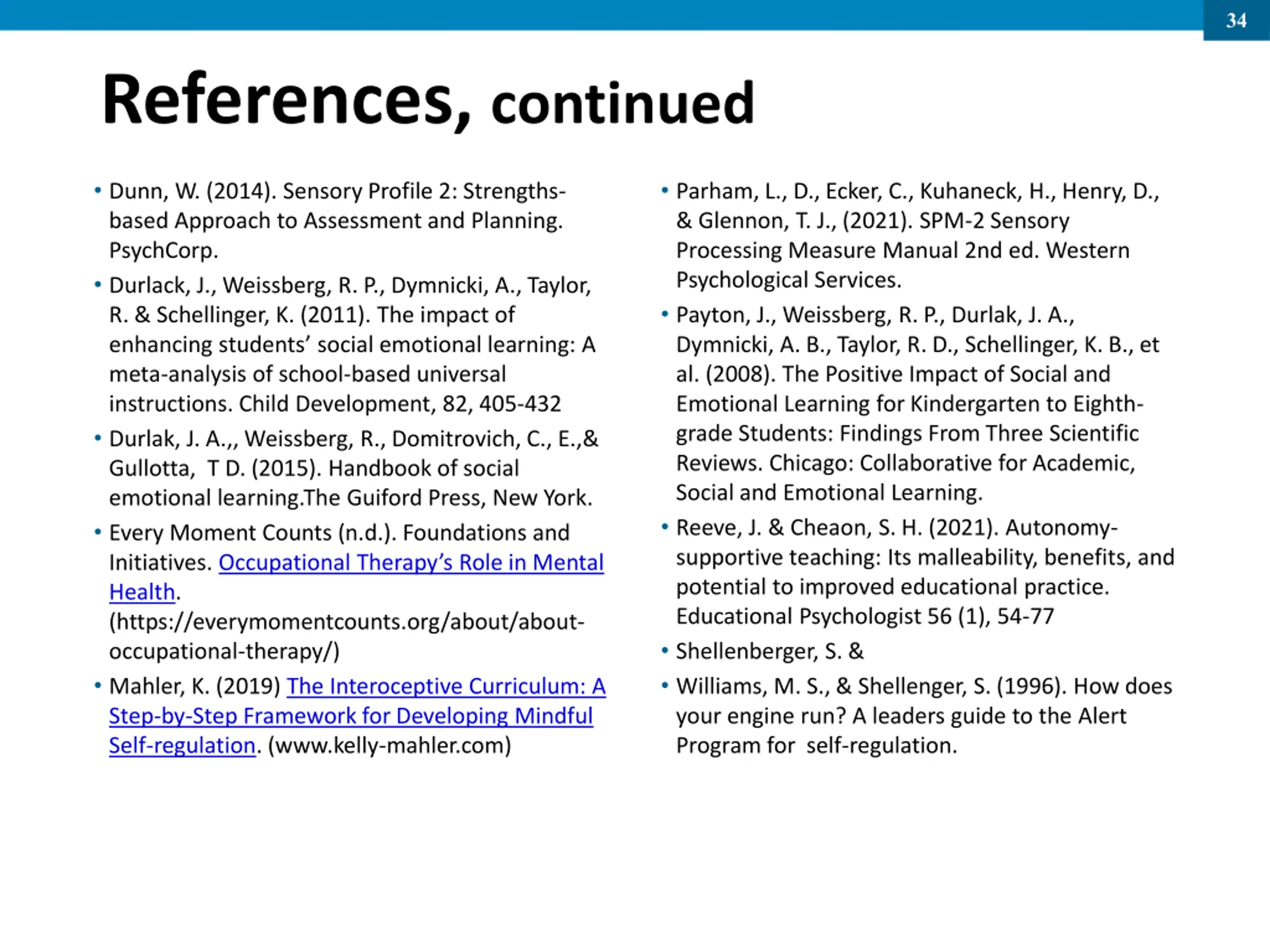 34 References, continued Dunn, W. (2014). Sensory Profile 2: Strengths- based Approach to Assessment and Planning. PsychCorp. Durlack, J., Weissberg, R. P., Dymnicki, A., Taylor, R. & Schellinger, K. (2011). The impact of enhancing students social emotional learning: A meta-analysis of school-based universal instructions. Child Development, 82, 405-432 Durlak, J. A.,, Weissberg, R., Domitrovich, C., E.,& Gullotta, T D. (2015). Handbook of social emotional learning.The Guiford Press, New York. Every Moment Counts (n.d.). Foundations and Initiatives. Occupational Therapy s Role in Mental Health. (https://everymomentcounts.org/about/about- occupational-therapy/) Mahler, K. (2019) The Interoceptive Curriculum: A Step-by-Step Framework for Developing Mindful Self-regulation. (www.kelly-mahler.com) Parham, L., D., Ecker, C., Kuhaneck, H., Henry, D., & Glennon, T. J., (2021). SPM-2 Sensory Processing Measure Manual 2nd ed. Western Psychological Services. Payton, J., Weissberg, R. P., Durlak, J. A., Dymnicki, A. B., Taylor, R. D., Schellinger, K. B., et al. (2008). The Positive Impact of Social and Emotional Learning for Kindergarten to Eighth- grade Students: Findings From Three Scientific Reviews. Chicago: Collaborative for Academic, Social and Emotional Learning. Reeve, J. & Cheaon, S. H. (2021). Autonomy- supportive teaching: Its malleability, benefits, and potential to improved educational practice. Educational Psychologist 56 (1), 54-77 Shellenberger, S. & Williams, M. S., & Shellenger, S. (1996). How does your engine run? A leaders guide to the Alert Program for self-regulation.