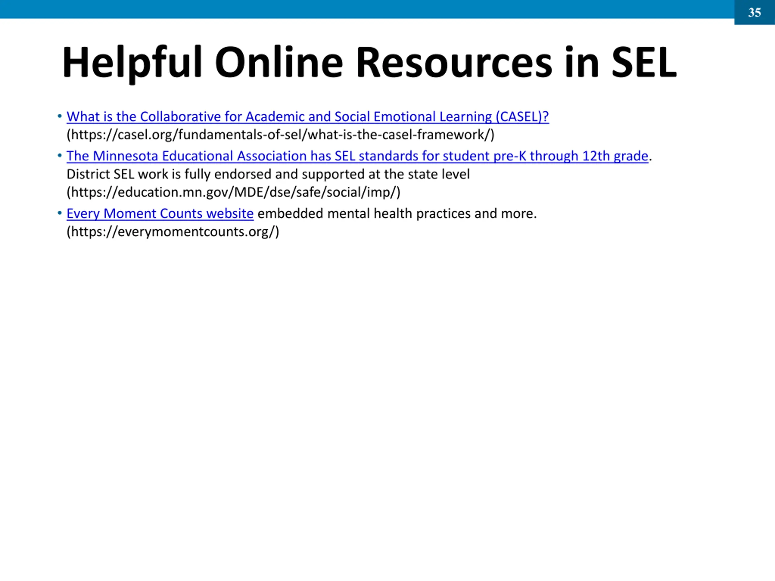 35 Helpful Online Resources in SEL What is the Collaborative for Academic and Social Emotional Learning (CASEL)? (https://casel.org/fundamentals-of-sel/what-is-the-casel-framework/) The Minnesota Educational Association has SEL standards for student pre-K through 12th grade. District SEL work is fully endorsed and supported at the state level (https://education.mn.gov/MDE/dse/safe/social/imp/) Every Moment Counts website embedded mental health practices and more. (https://everymomentcounts.org/)