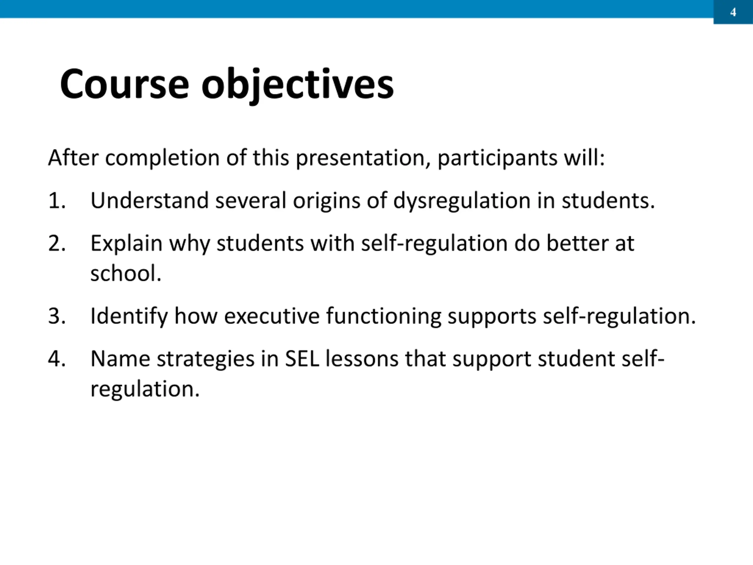 4 Course objectives After completion of this presentation, participants will: 1. Understand several origins of dysregulation in students. 2. Explain why students with self-regulation do better at school. 3. Identify how executive functioning supports self-regulation. 4. Name strategies in SEL lessons that support student self- regulation.