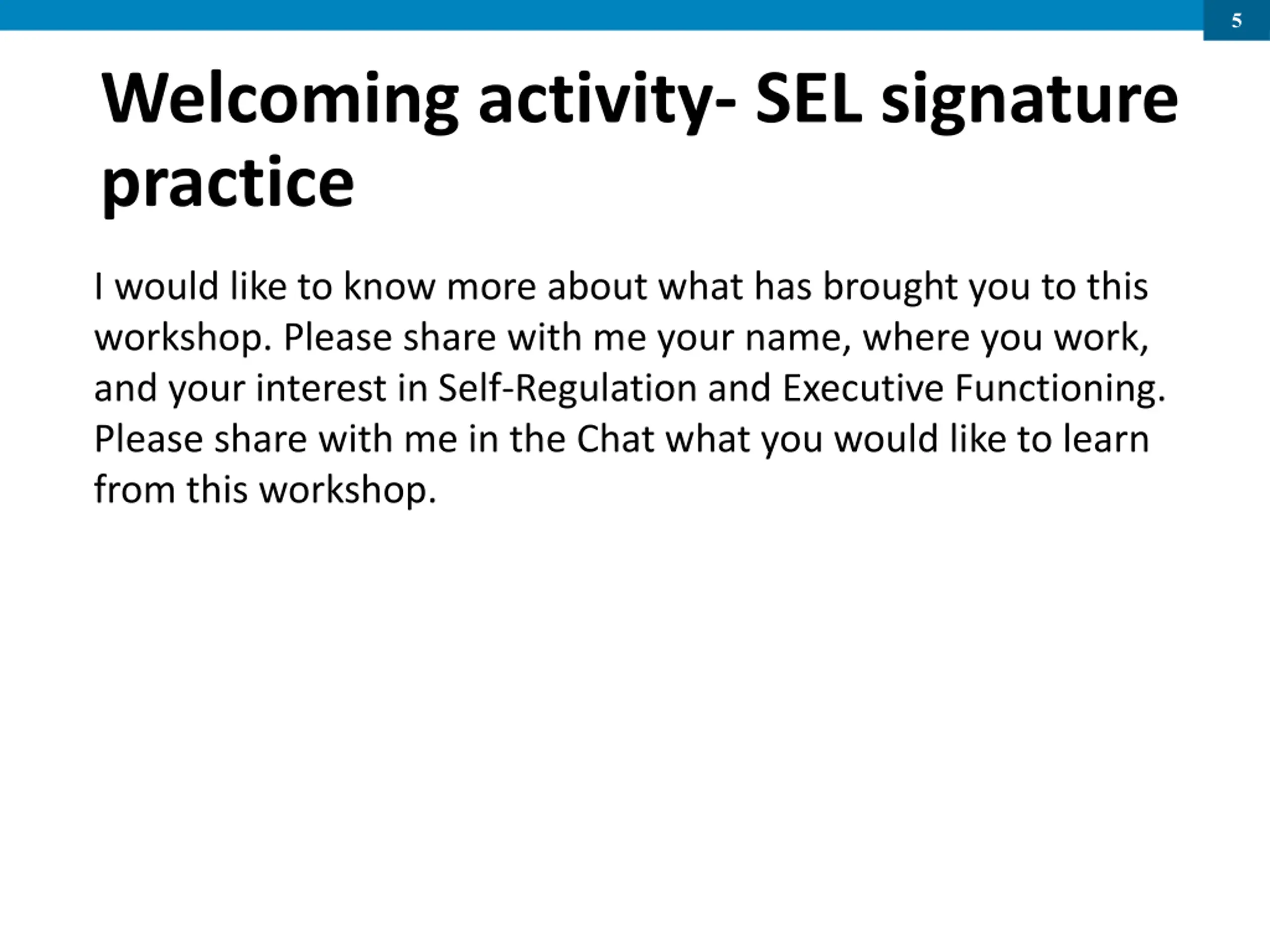 5 Welcoming activity- SEL signature practice I would like to know more about what has brought you to this workshop. Please share with me your name, where you work, and your interest in Self-Regulation and Executive Functioning. Please share with me in the Chat what you would like to learn from this workshop.