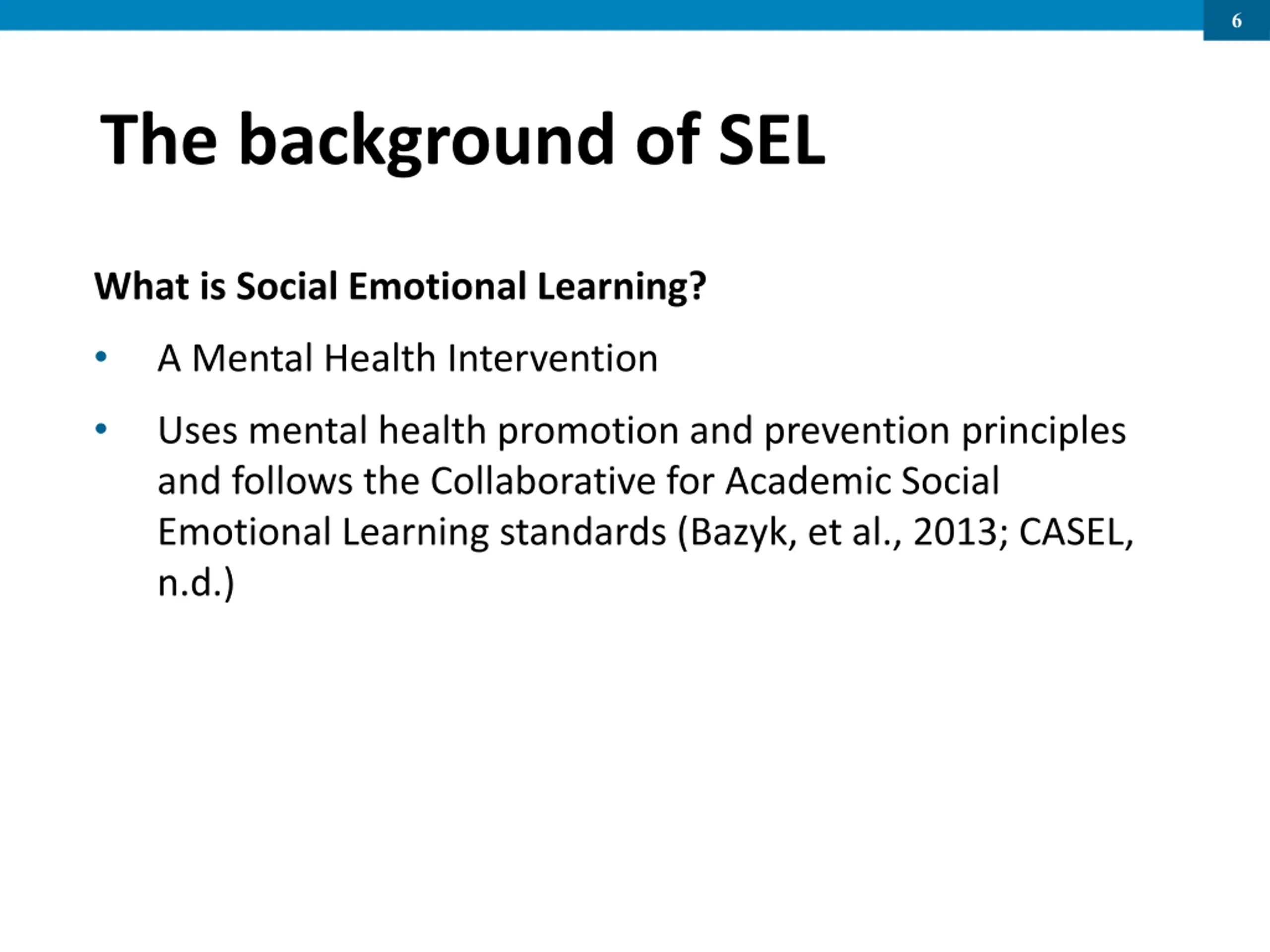 6 The background of SEL What is Social Emotional Learning? A Mental Health Intervention Uses mental health promotion and prevention principles and follows the Collaborative for Academic Social Emotional Learning standards (Bazyk, et al., 2013; CASEL, n.d.)