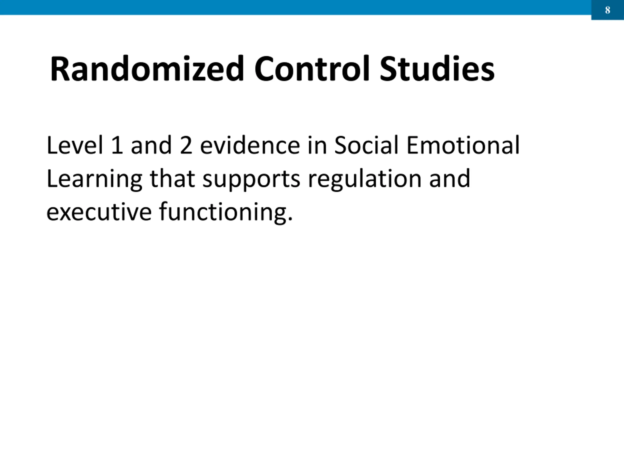 8 Randomized Control Studies Level 1 and 2 evidence in Social Emotional Learning that supports regulation and executive functioning.
