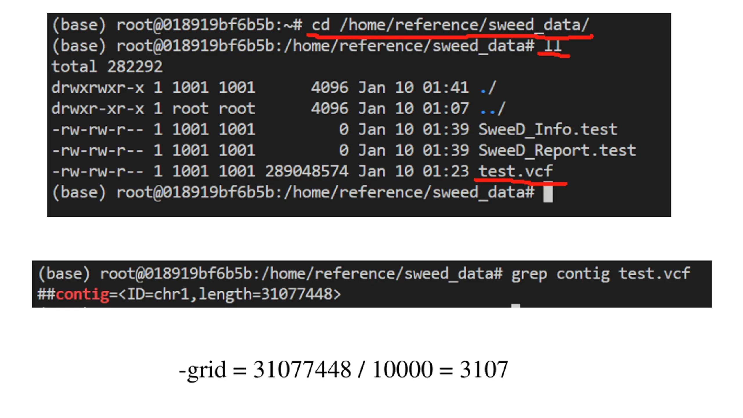 Usage Input data -> .vcf file Extract single chromosome vcf file $ vcftools --vcf test.vcf --recode --recode-INFO-all --stdout --chr chr1 > chr1.vcf Calculate SweeD windows (10kb) $ grep chr1 chr1.vcf ##contig=<ID=chr1,length=31077448> -grid = 31077448 / 10000 = 3107