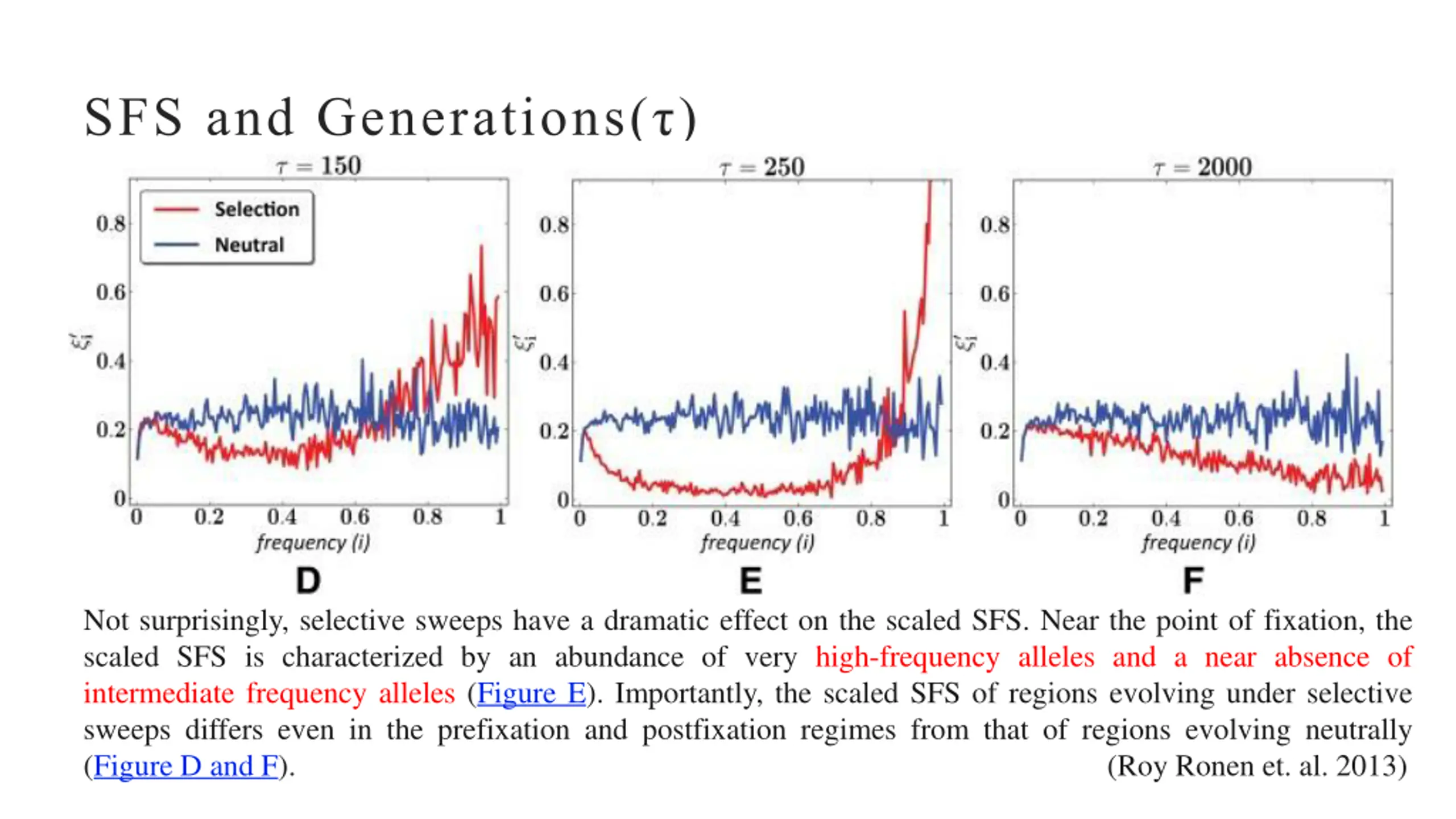 SFS and Generations() Not surprisingly, selective sweeps have a dramatic effect on the scaled SFS. Near the point of fixation, the scaled SFS is characterized by an abundance of very high-frequency alleles and a near absence of intermediate frequency alleles (Figure E). Importantly, the scaled SFS of regions evolving under selective sweeps differs even in the prefixation and postfixation regimes from that of regions evolving neutrally (Figure D and F). (Roy Ronen et. al. 2013)