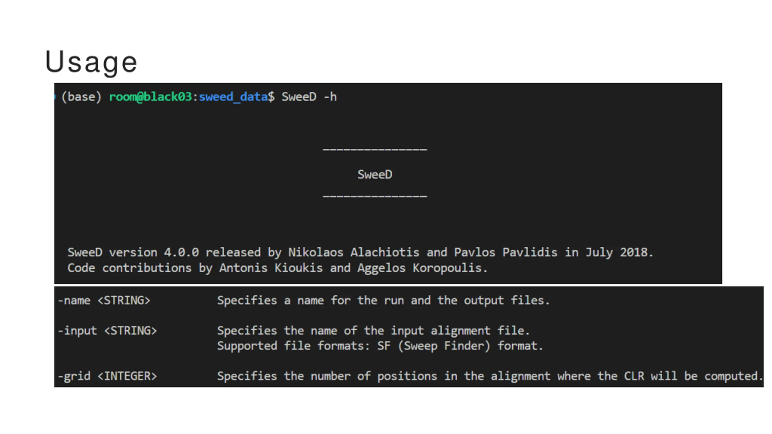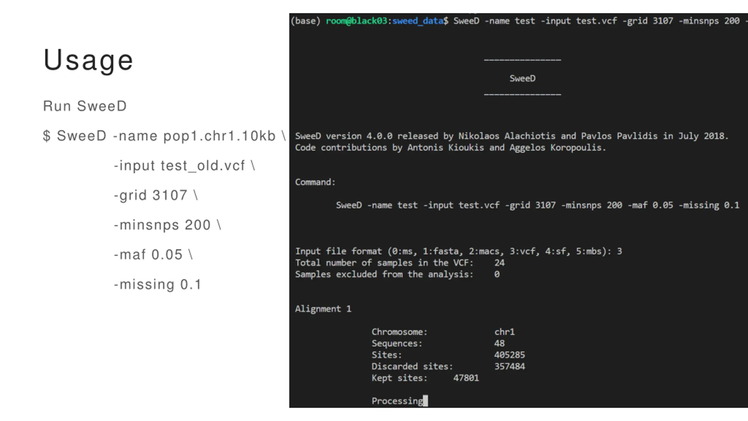 Usage Run SweeD $ SweeD -name pop1.chr1.10kb \ -input test_old.vcf \ -grid 3107 \ -minsnps 200 \ -maf 0.05 \ -missing 0.1