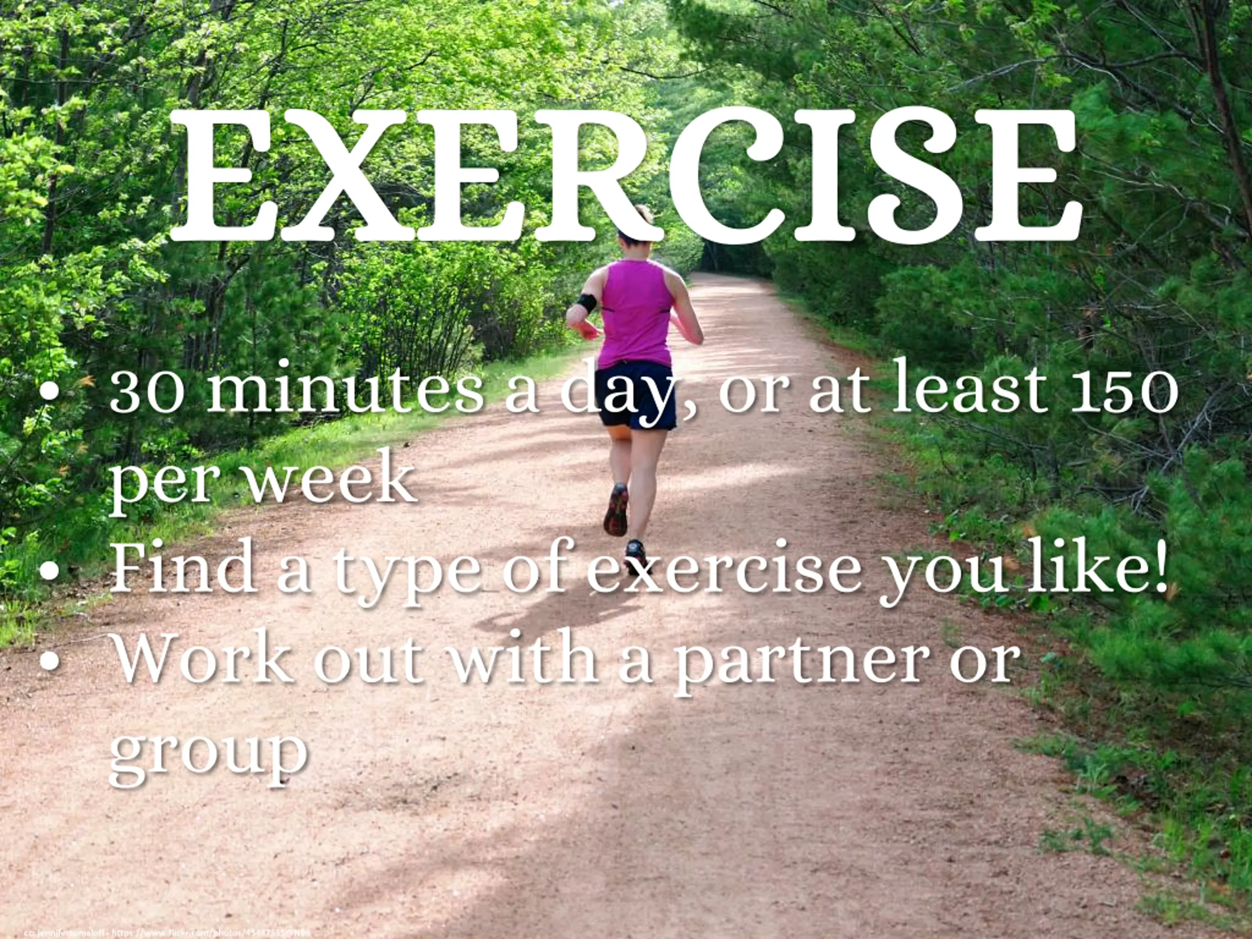 EXERCISE EXERCISE 30 minutes a day, or at least 150 per week Find a type of exercise you like! Work out with a partner or group cc: jennifertomaloff - https://www.flickr.com/photos/45487535@N08