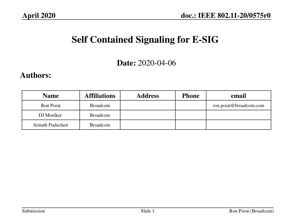 April 2020 doc.: IEEE 802.11-20/0575r0 Self Contained Signaling for E-SIG Date: 2020-04-06 Authors: Name Affiliations Address Phone email Ron Porat Broadcom ron.porat@broadcom.com DJ Moelker Broadcom Srinath Puducheri Broadcom Submission Slide 1 Ron Porat (Broadcom)