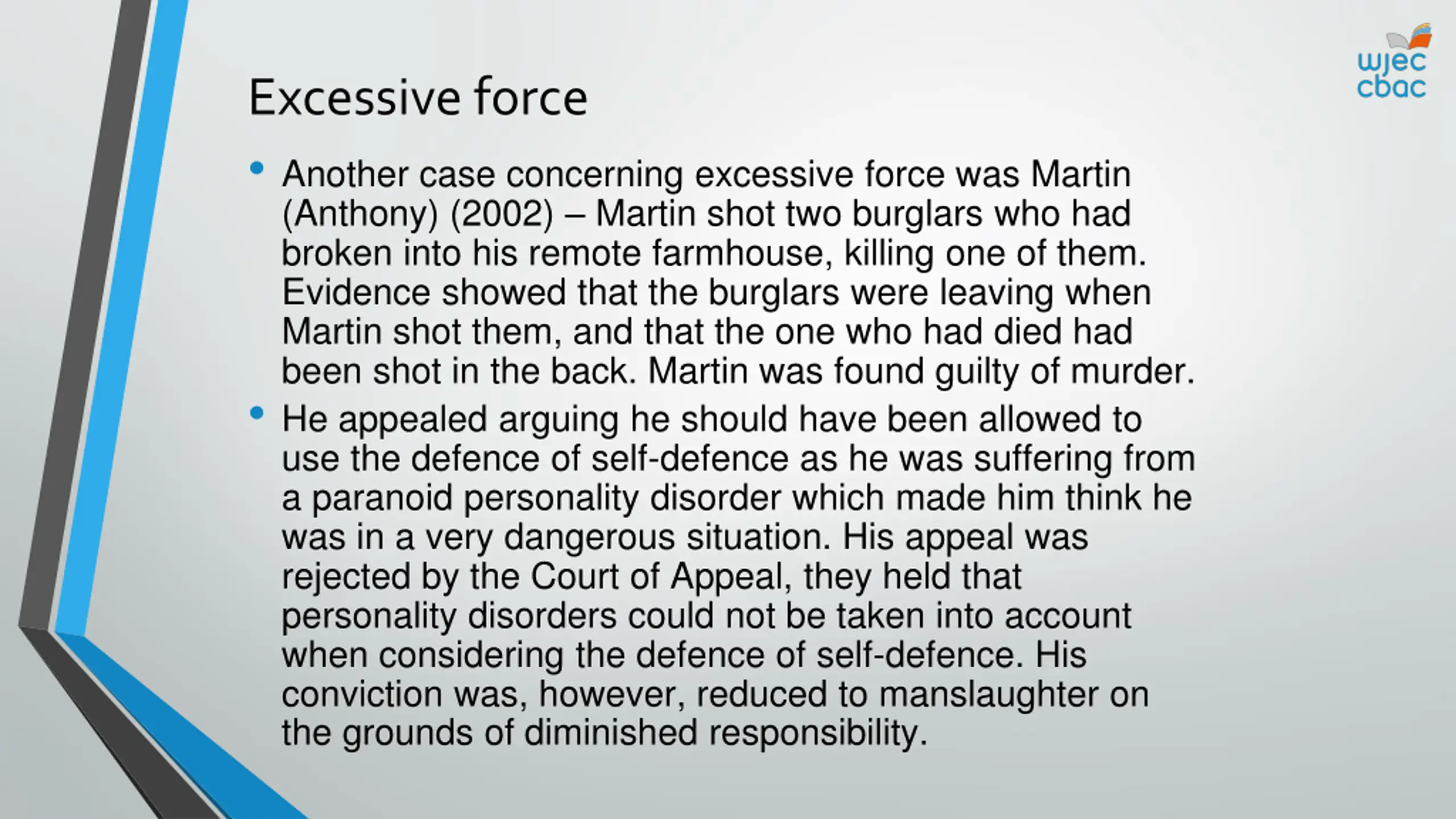 Excessive force Another case concerning excessive force was Martin (Anthony) (2002) Martin shot two burglars who had broken into his remote farmhouse, killing one of them. Evidence showed that the burglars were leaving when Martin shot them, and that the one who had died had been shot in the back. Martin was found guilty of murder. He appealed arguing he should have been allowed to use the defence of self-defence as he was suffering from a paranoid personality disorder which made him think he was in a very dangerous situation. His appeal was rejected by the Court of Appeal, they held that personality disorders could not be taken into account when considering the defence of self-defence. His conviction was, however, reduced to manslaughter on the grounds of diminished responsibility.