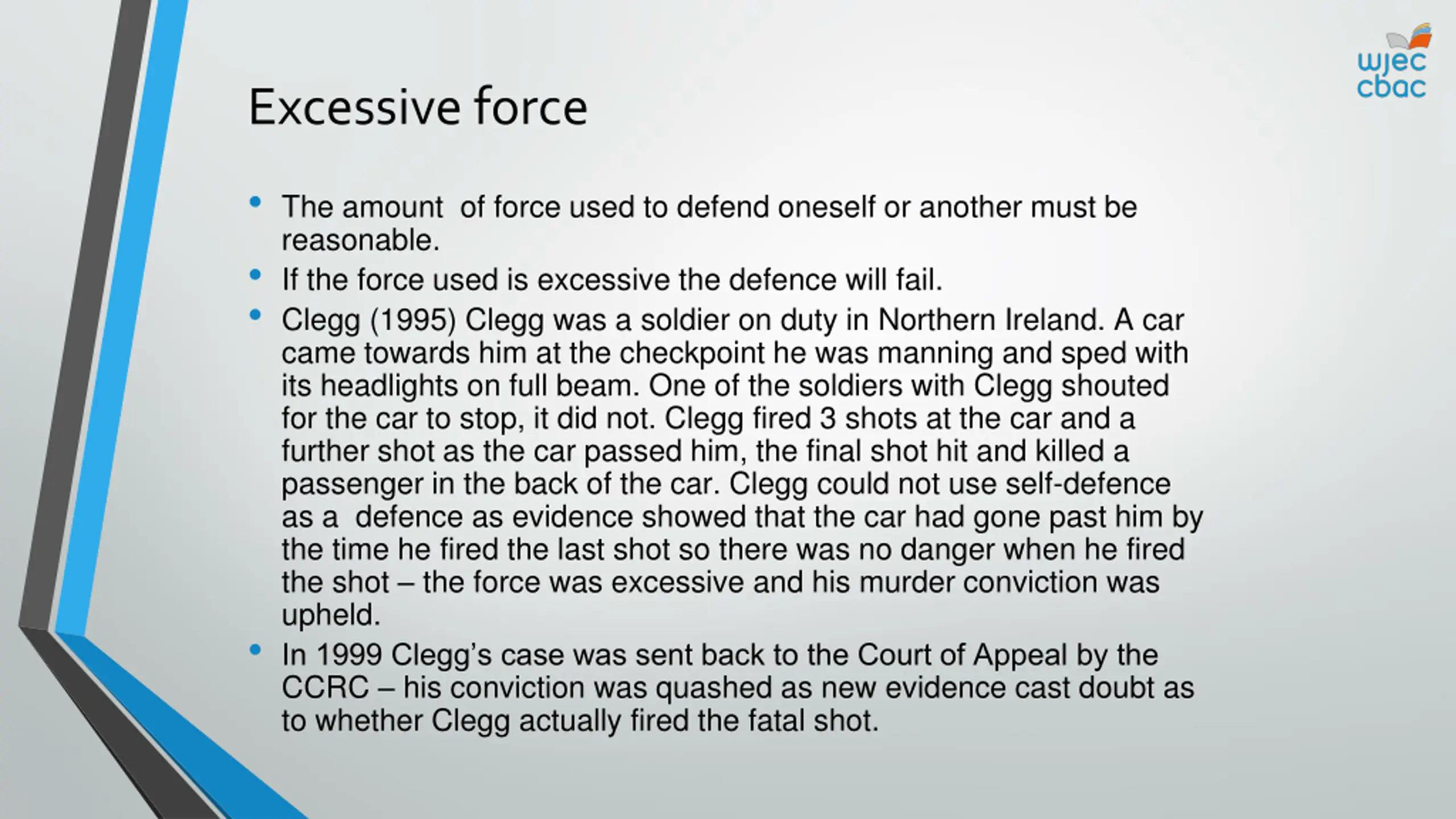 Excessive force The amount of force used to defend oneself or another must be reasonable. If the force used is excessive the defence will fail. Clegg (1995) Clegg was a soldier on duty in Northern Ireland. A car came towards him at the checkpoint he was manning and sped with its headlights on full beam. One of the soldiers with Clegg shouted for the car to stop, it did not. Clegg fired 3 shots at the car and a further shot as the car passed him, the final shot hit and killed a passenger in the back of the car. Clegg could not use self-defence as a defence as evidence showed that the car had gone past him by the time he fired the last shot so there was no danger when he fired the shot the force was excessive and his murder conviction was upheld. In 1999 Clegg s case was sent back to the Court of Appeal by the CCRC his conviction was quashed as new evidence cast doubt as to whether Clegg actually fired the fatal shot.
