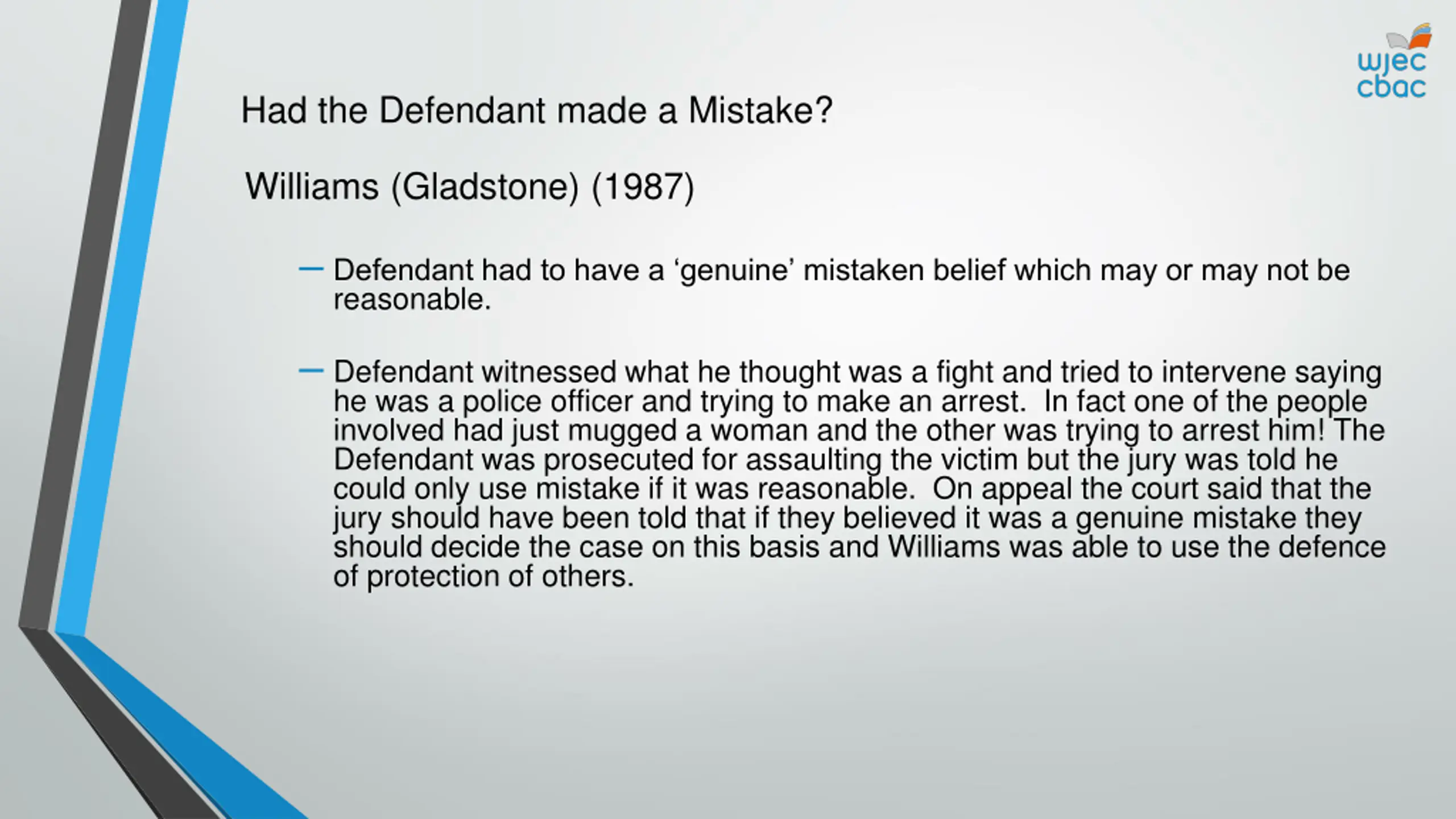Had the Defendant made a Mistake? Williams (Gladstone) (1987) Defendant had to have a genuine mistaken belief which may or may not be reasonable. Defendant witnessed what he thought was a fight and tried to intervene saying he was a police officer and trying to make an arrest. In fact one of the people involved had just mugged a woman and the other was trying to arrest him! The Defendant was prosecuted for assaulting the victim but the jury was told he could only use mistake if it was reasonable. On appeal the court said that the jury should have been told that if they believed it was a genuine mistake they should decide the case on this basis and Williams was able to use the defence of protection of others.