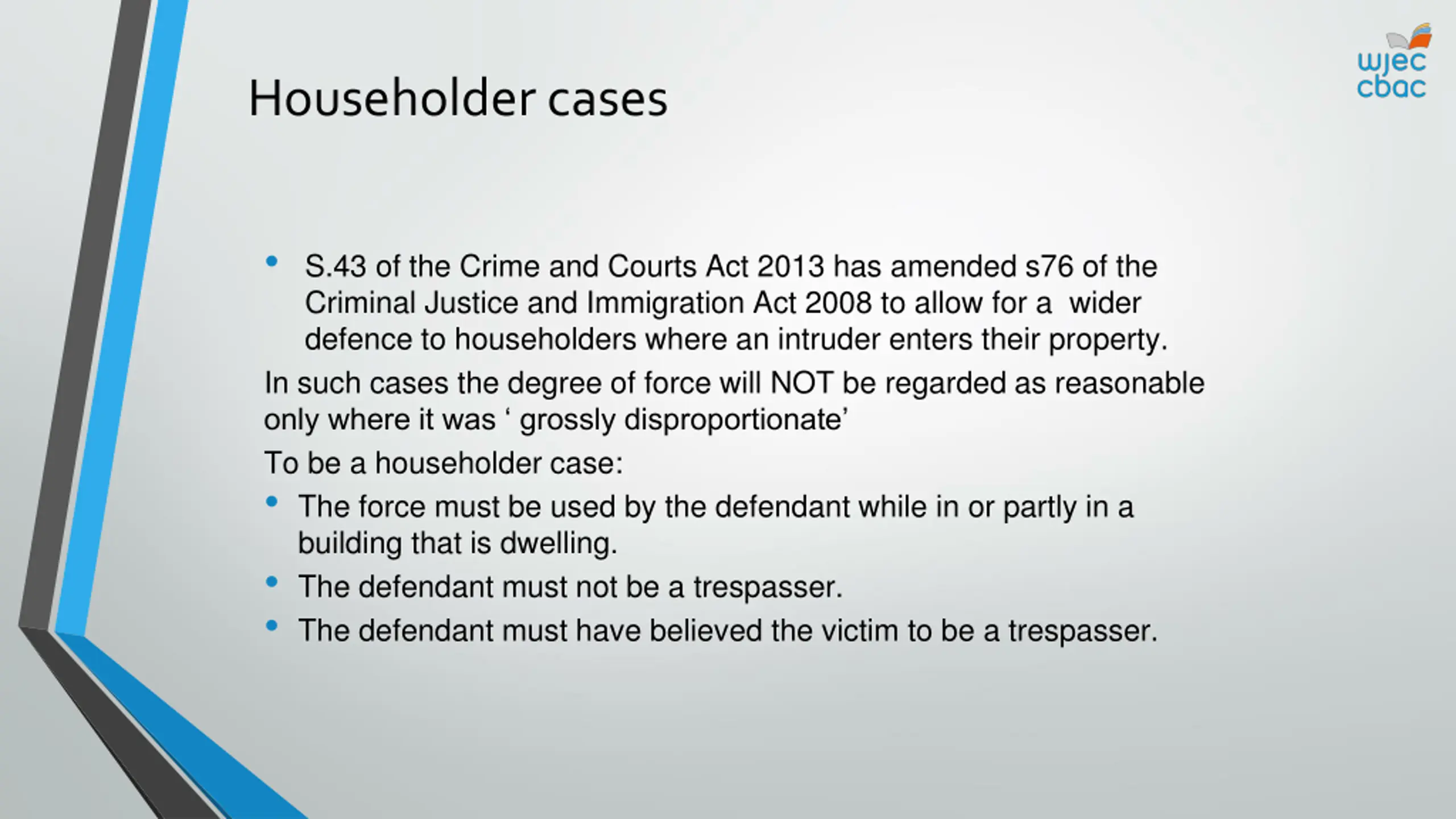 Householder cases S.43 of the Crime and Courts Act 2013 has amended s76 of the Criminal Justice and Immigration Act 2008 to allow for a wider defence to householders where an intruder enters their property. In such cases the degree of force will NOT be regarded as reasonable only where it was grossly disproportionate To be a householder case: The force must be used by the defendant while in or partly in a building that is dwelling. The defendant must not be a trespasser. The defendant must have believed the victim to be a trespasser.
