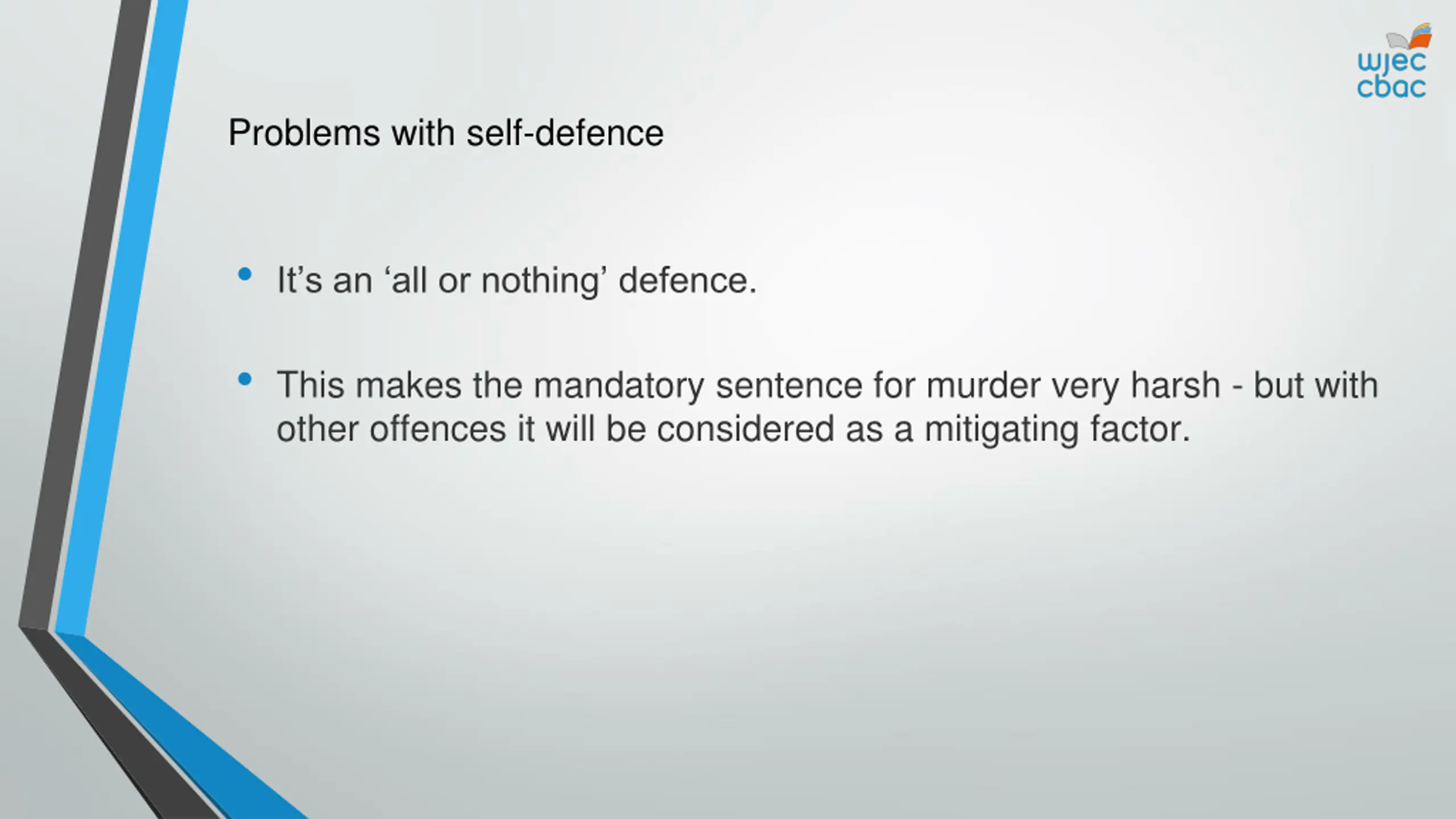 Problems with self-defence It s an all or nothing defence. This makes the mandatory sentence for murder very harsh - but with other offences it will be considered as a mitigating factor.