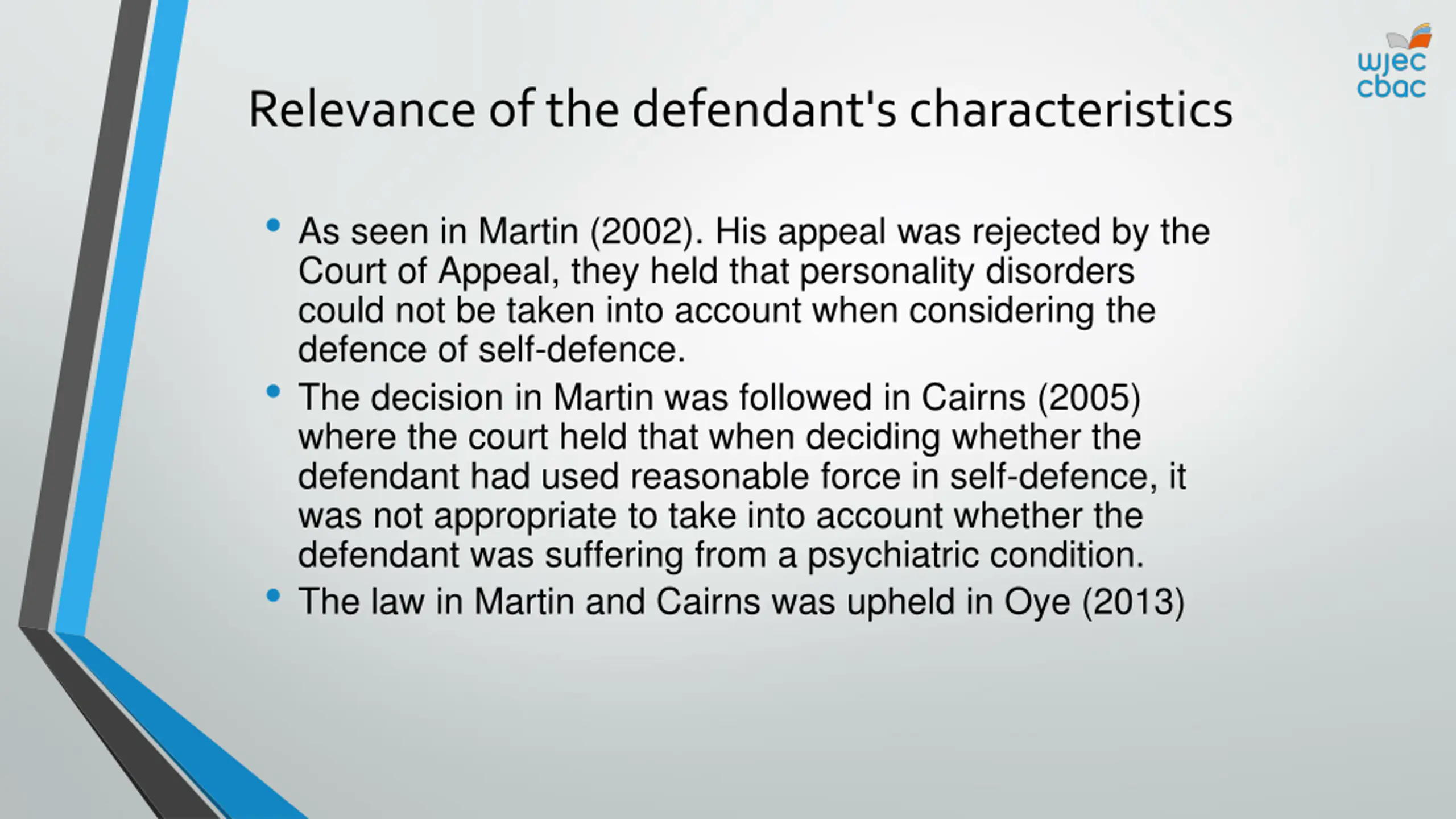 Relevance of the defendant's characteristics As seen in Martin (2002). His appeal was rejected by the Court of Appeal, they held that personality disorders could not be taken into account when considering the defence of self-defence. The decision in Martin was followed in Cairns (2005) where the court held that when deciding whether the defendant had used reasonable force in self-defence, it was not appropriate to take into account whether the defendant was suffering from a psychiatric condition. The law in Martin and Cairns was upheld in Oye (2013)