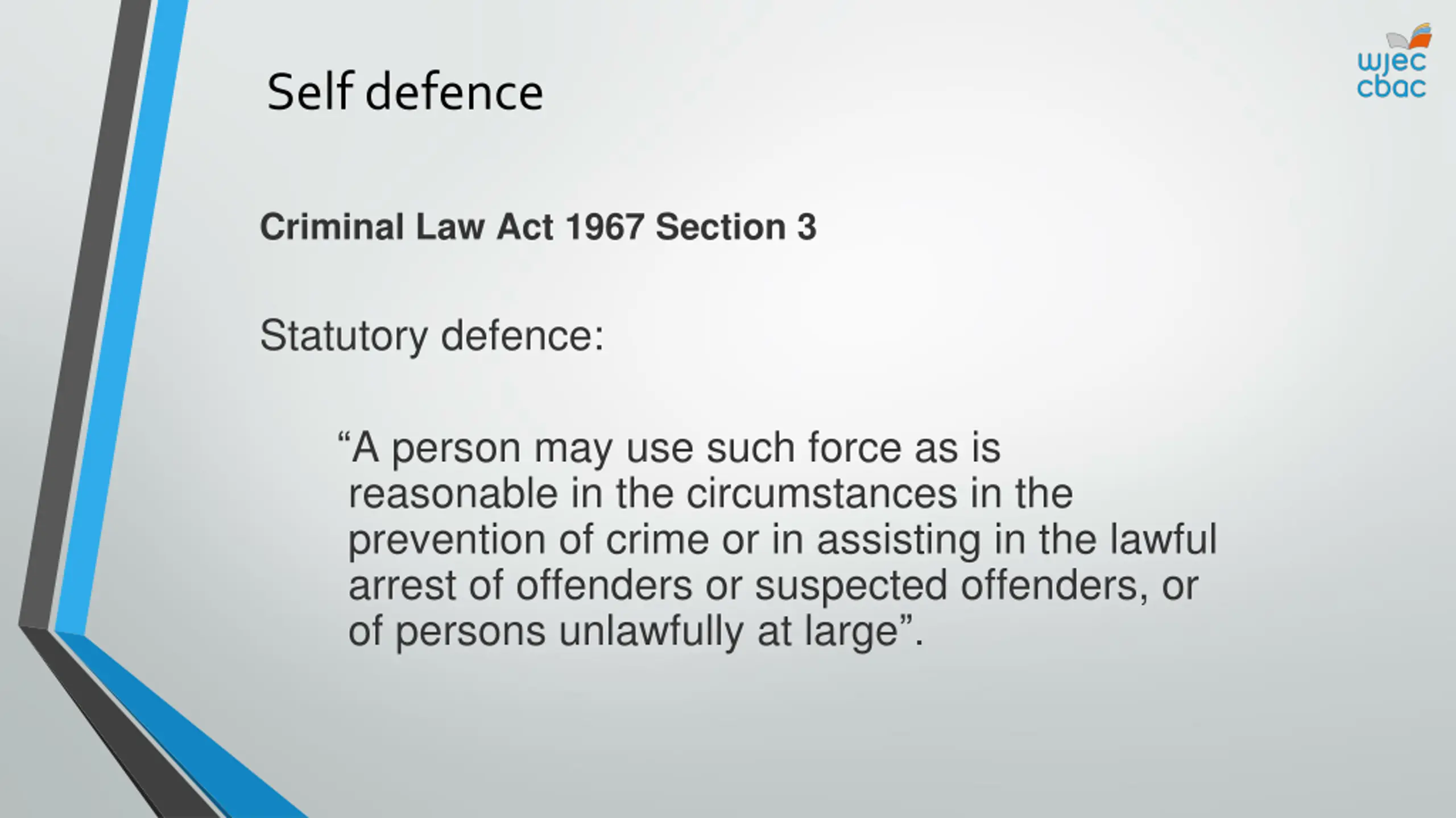 Self defence Criminal Law Act 1967 Section 3 Statutory defence: A person may use such force as is reasonable in the circumstances in the prevention of crime or in assisting in the lawful arrest of offenders or suspected offenders, or of persons unlawfully at large .