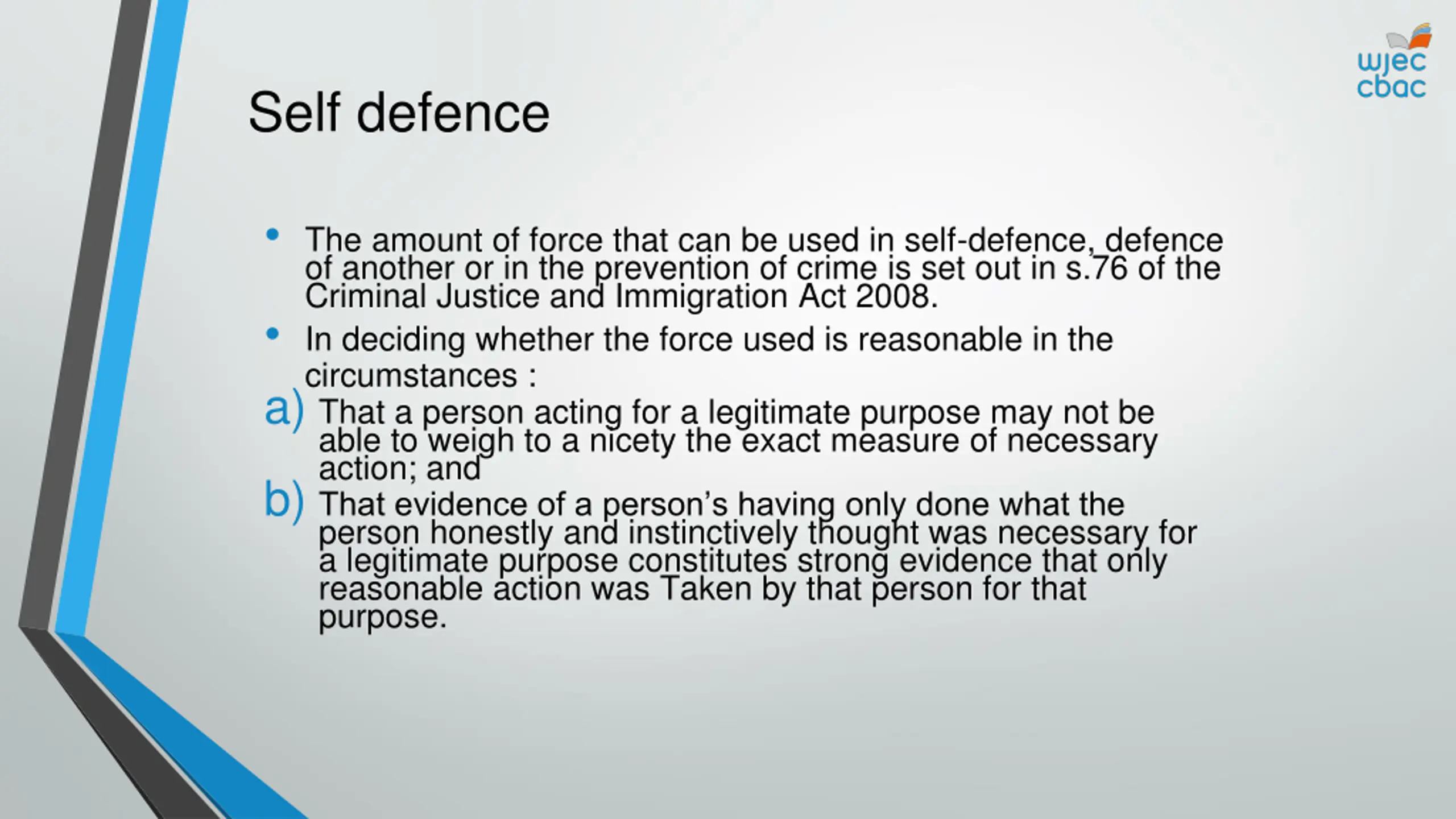 Self defence The amount of force that can be used in self-defence, defence of another or in the prevention of crime is set out in s.76 of the Criminal Justice and Immigration Act 2008. In deciding whether the force used is reasonable in the circumstances : a) That a person acting for a legitimate purpose may not be able to weigh to a nicety the exact measure of necessary action; and b) That evidence of a person s having only done what the person honestly and instinctively thought was necessary for a legitimate purpose constitutes strong evidence that only reasonable action was Taken by that person for that purpose.