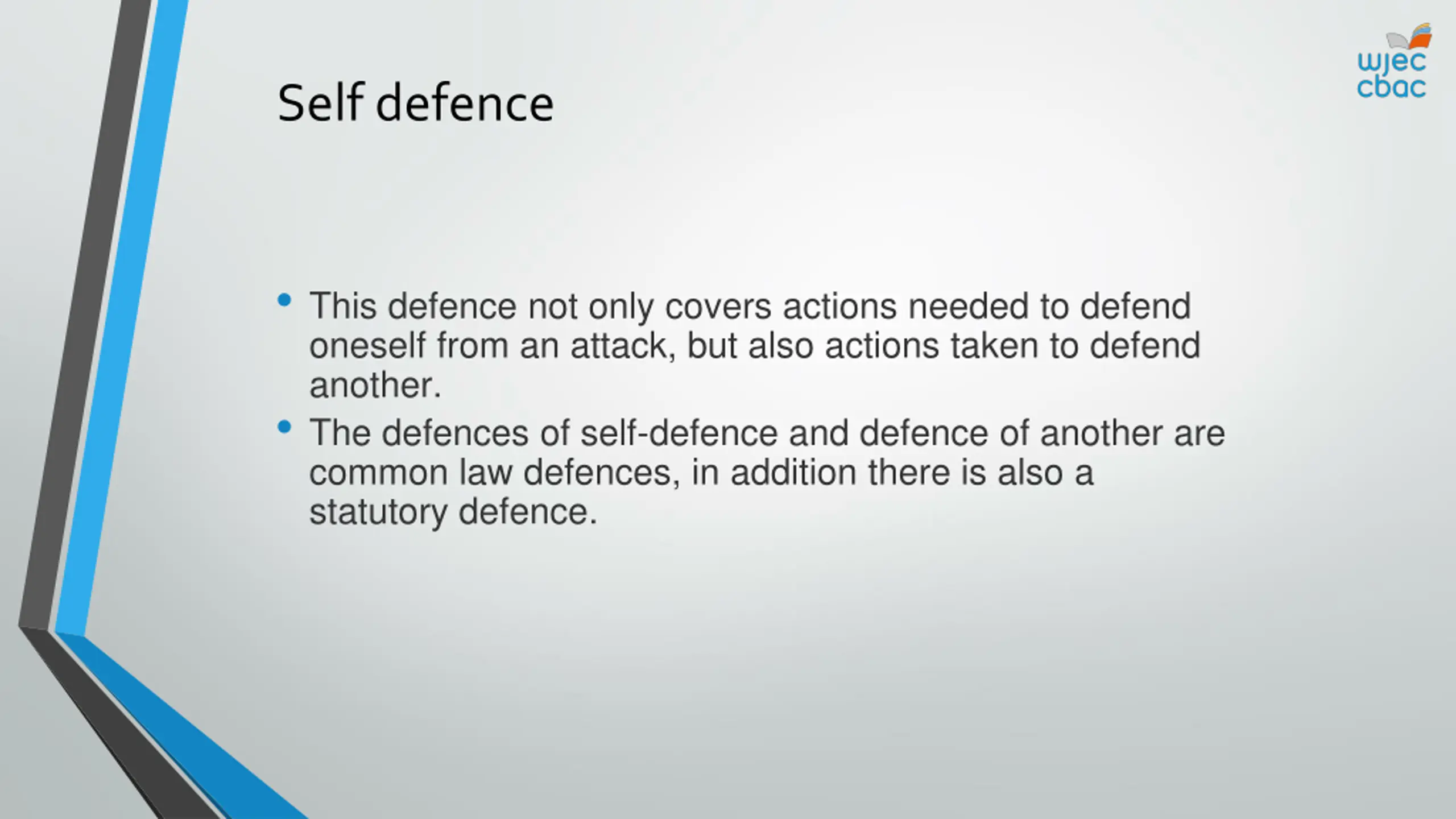 Self defence This defence not only covers actions needed to defend oneself from an attack, but also actions taken to defend another. The defences of self-defence and defence of another are common law defences, in addition there is also a statutory defence.